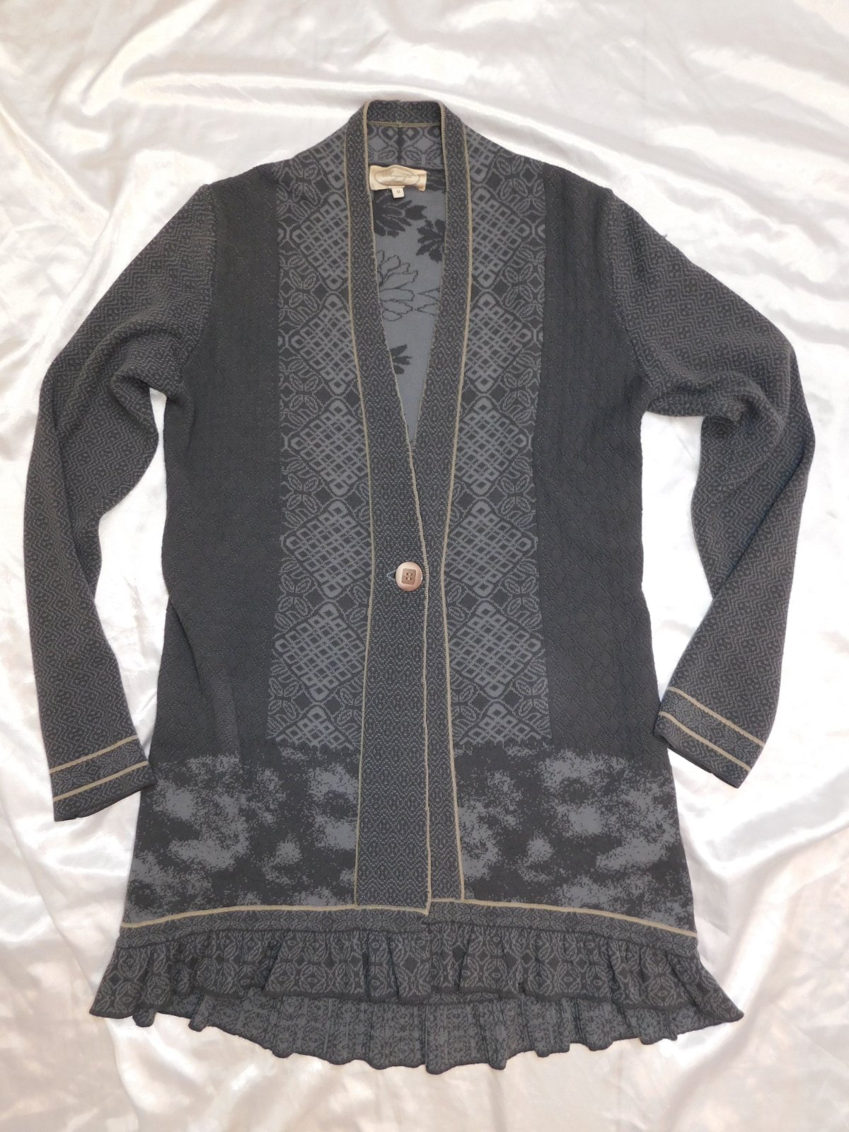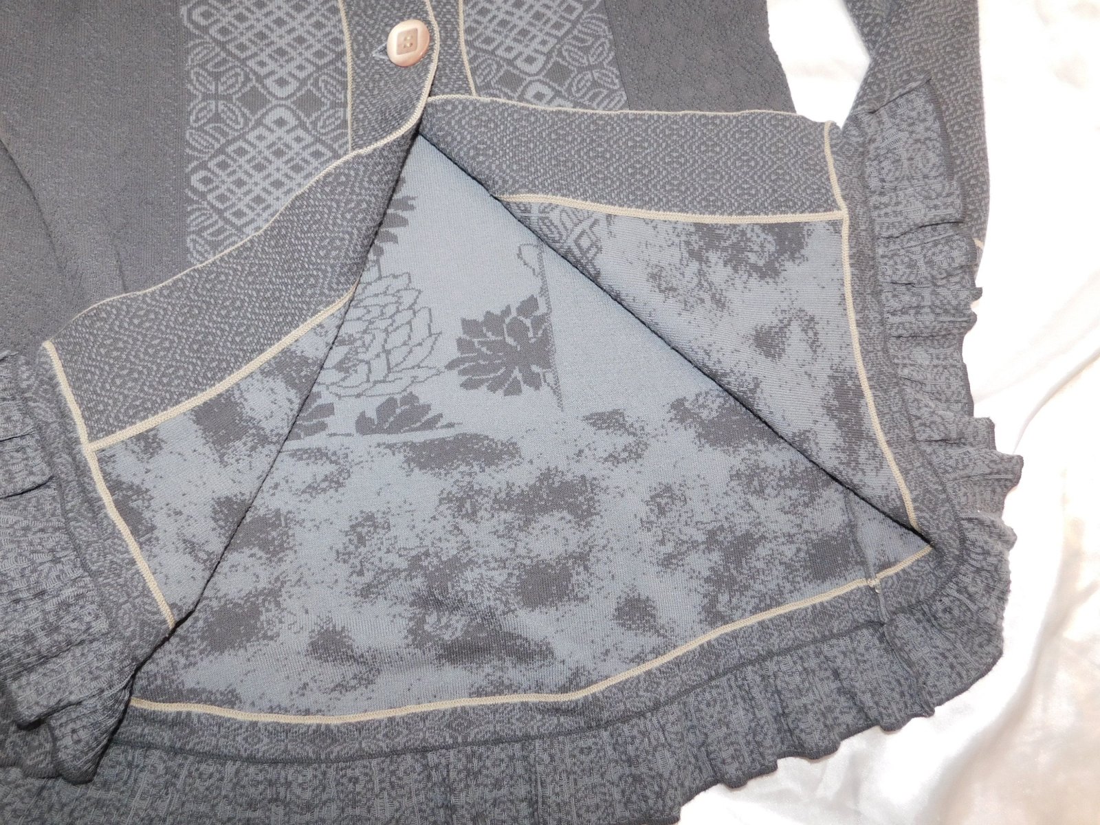 Luxusny damsky kardigan,šedej farby,pleteny mix,zapinanie na 1 gombik.67%viskoza,29%polyacryl,4=polyester. super stav.PC 170€. j27