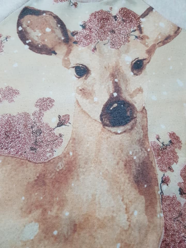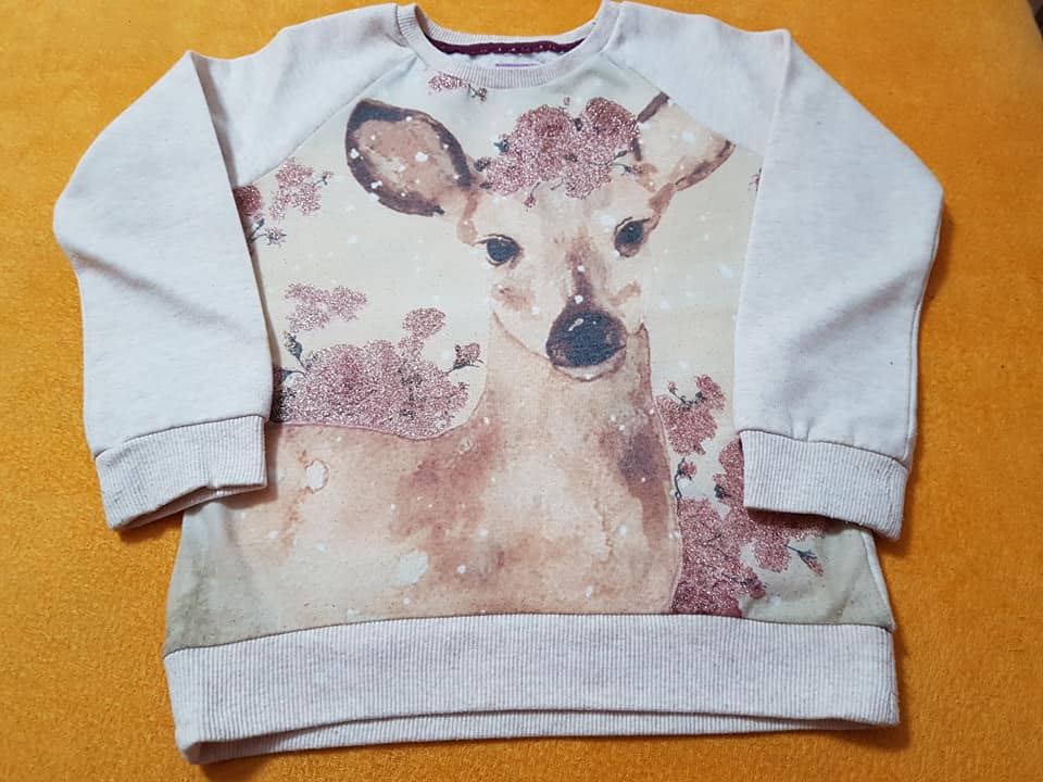 Predám krásny pulóvrik so srnkou vo veľkosti č. 116, na ľavom rukáve vzadu som našla fliačik od farby - viď foto, inak bez poškodení, či dier.