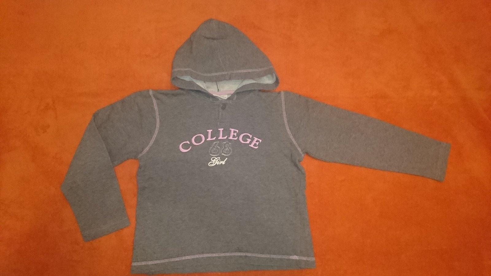 Dievčenska nosená, šedo – melírovaná mikina s kapucňou, s krátkým zapínaním pri krku na 1 gombík. Má ružové štepovanie – okolo kapucne, ramien a spodku. Klasický strih.