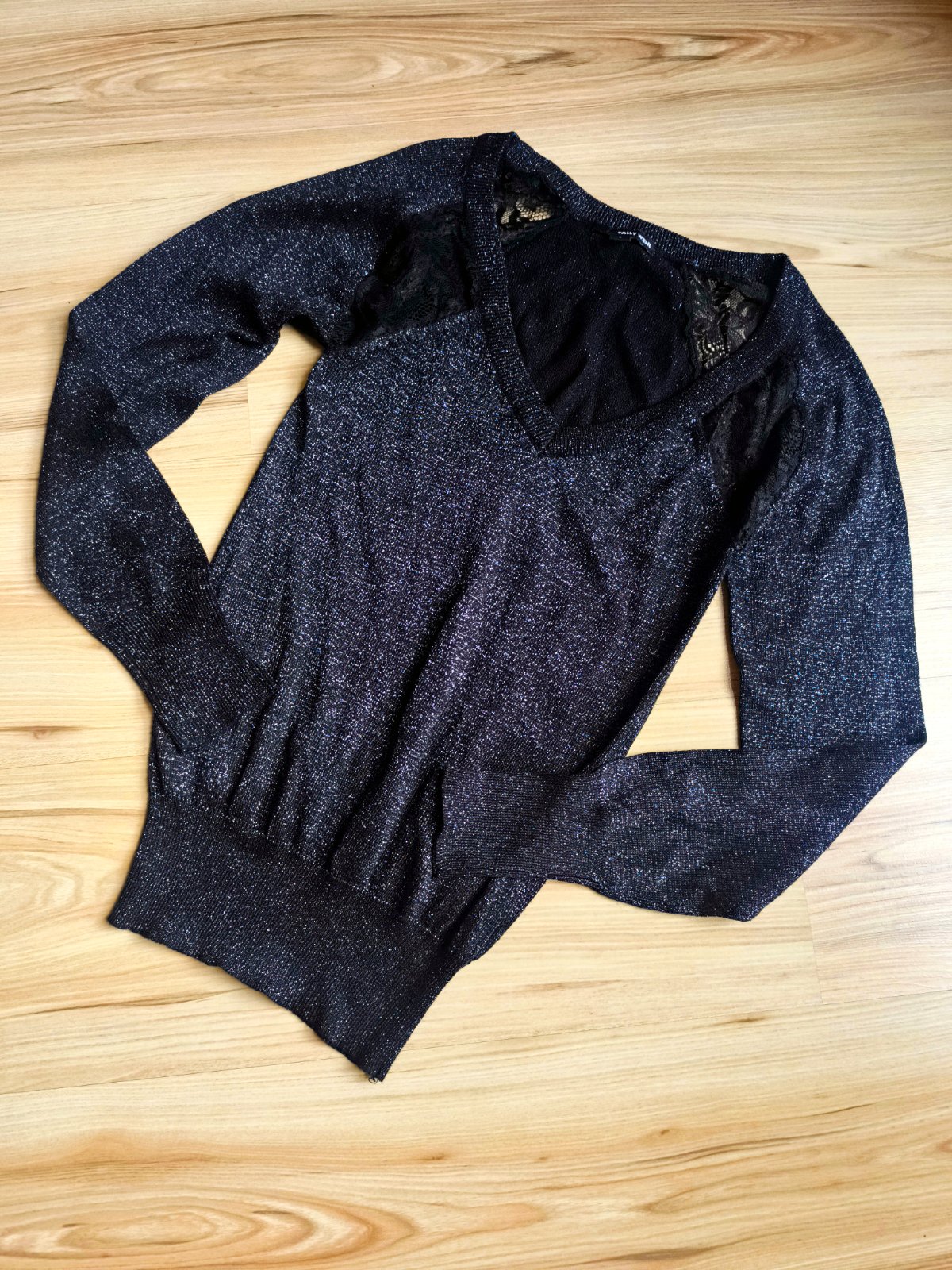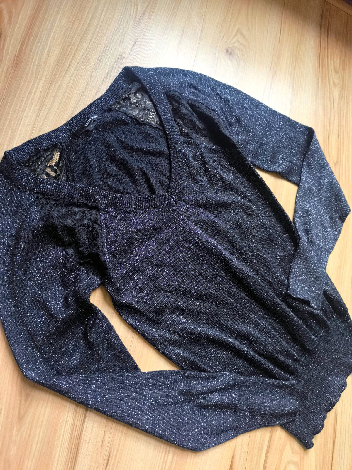 Trblietavý svetrík TALLY WEIJL, na vrchu s čipkou. Raz oblečený, ako nový, bez poškodení. Dole aj na rukavoch patent. Elasticky material.