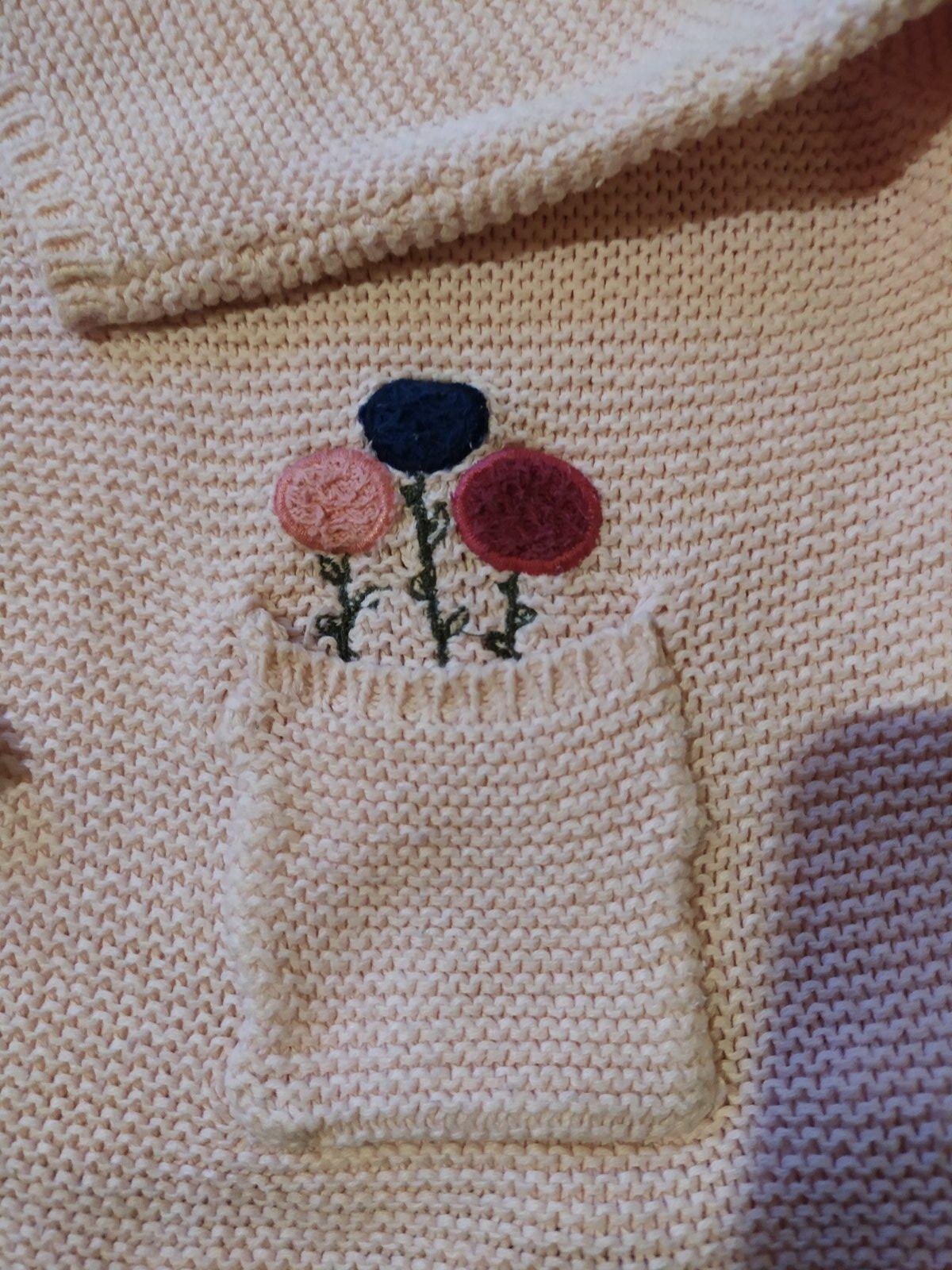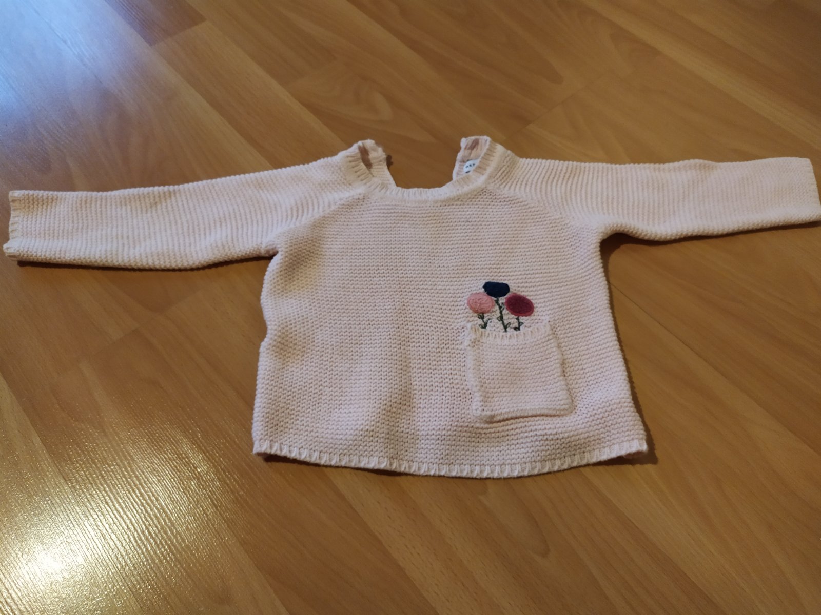 Jemný sveter s prímesou alpaky(aj napriek dierkovaniu teplý).Noseny bez poškodenia.Uvedena veľkosť 62,podľa mňa väčši( dcéra nosila od 2 -8 mesiacov)