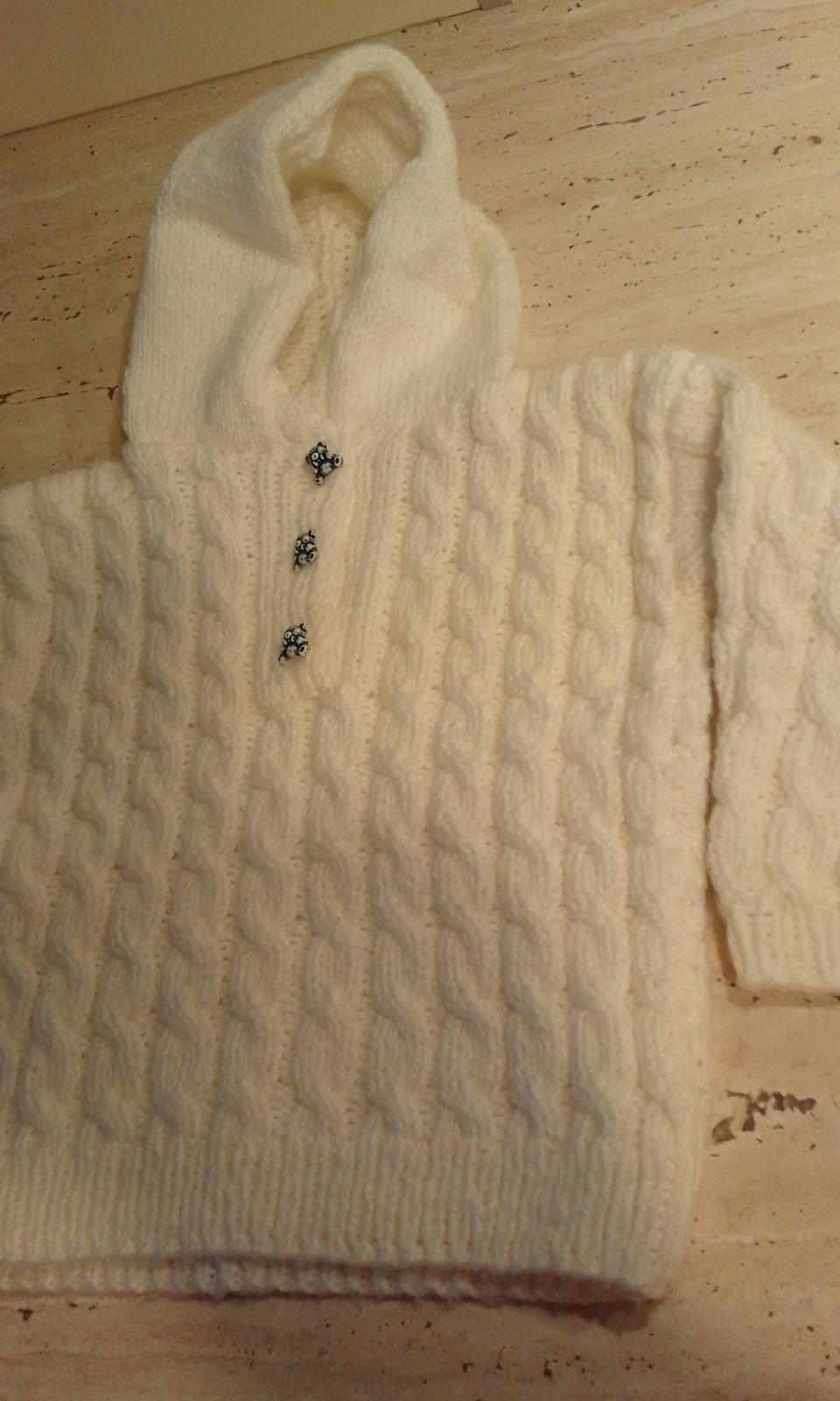 Pletený biely svetrík, vhodný pre chlapca i dievča, osmičkový vzor, s kapucňou, vo veľmi dobrom stave. Vhodný na chladnejšie dni.