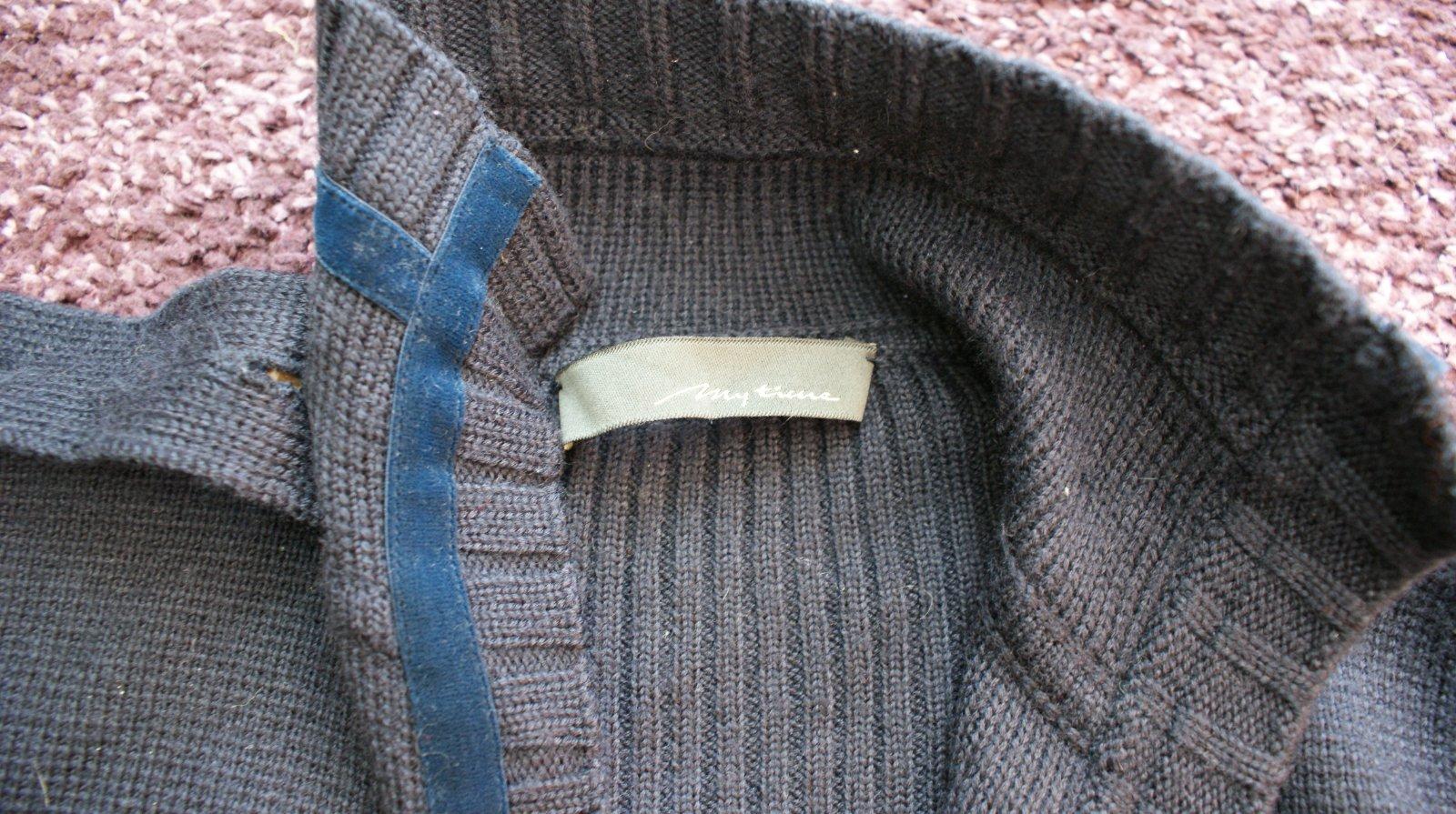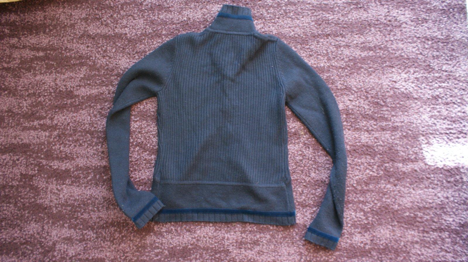 Ponukam zaujimavy stylovy svetrik znacky My time v tmavomodrej farbe so stojacikom. Zaujimavy strih, predne diely idu do poloblukov, zapina sa na cvocky a hore sa da este pripnut golierik o gombik vid.foto. Velkostne sa da nosit ako XS/S alebo mensie M. Je malo noseny, ale sem-tam minizmolky. Postovne podla tarif SP alebo osobny odber.