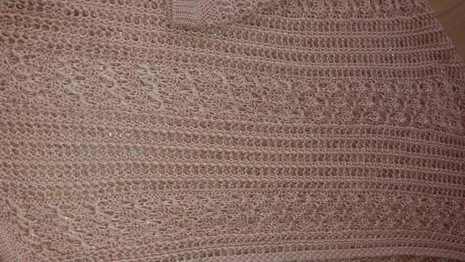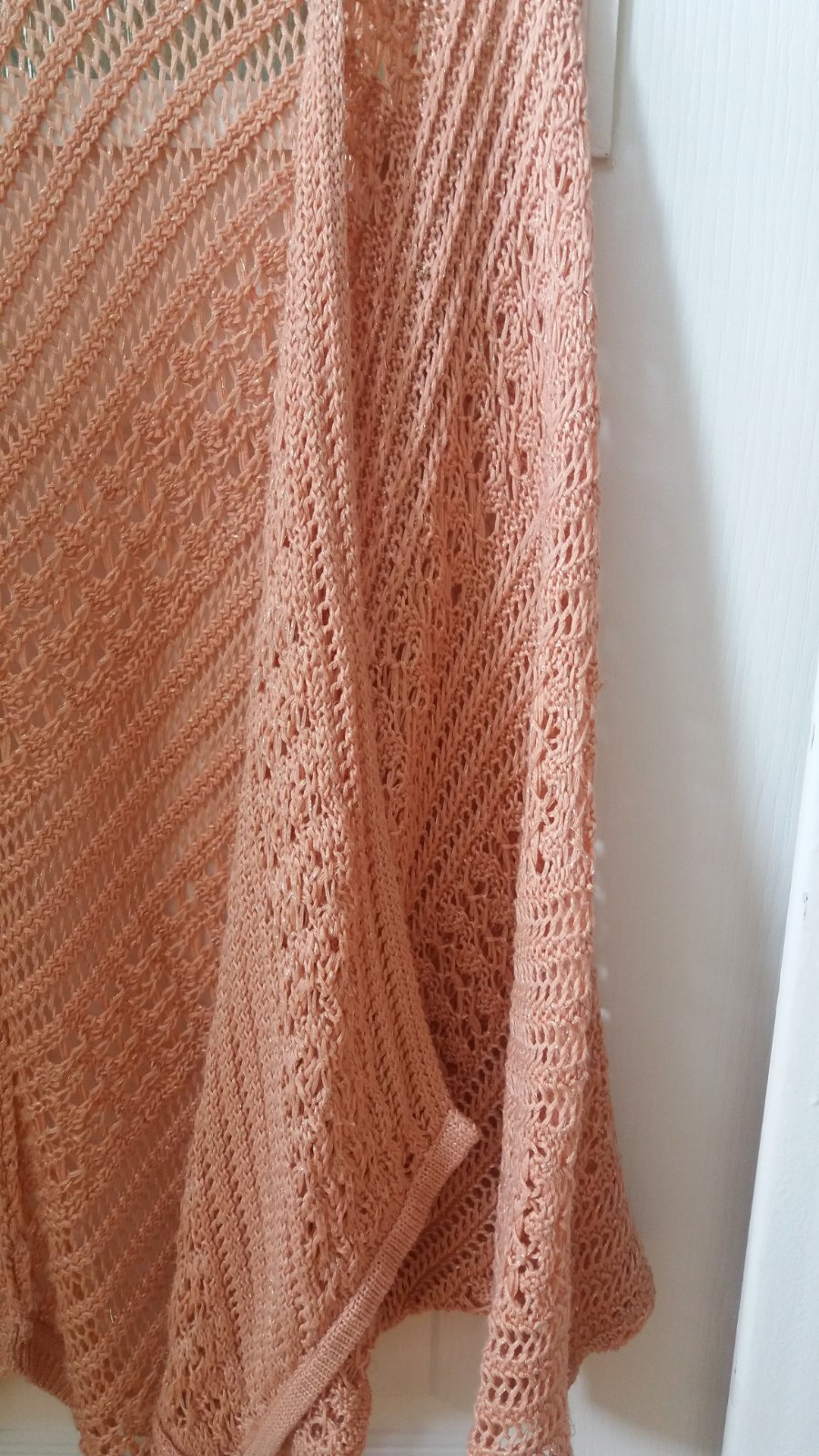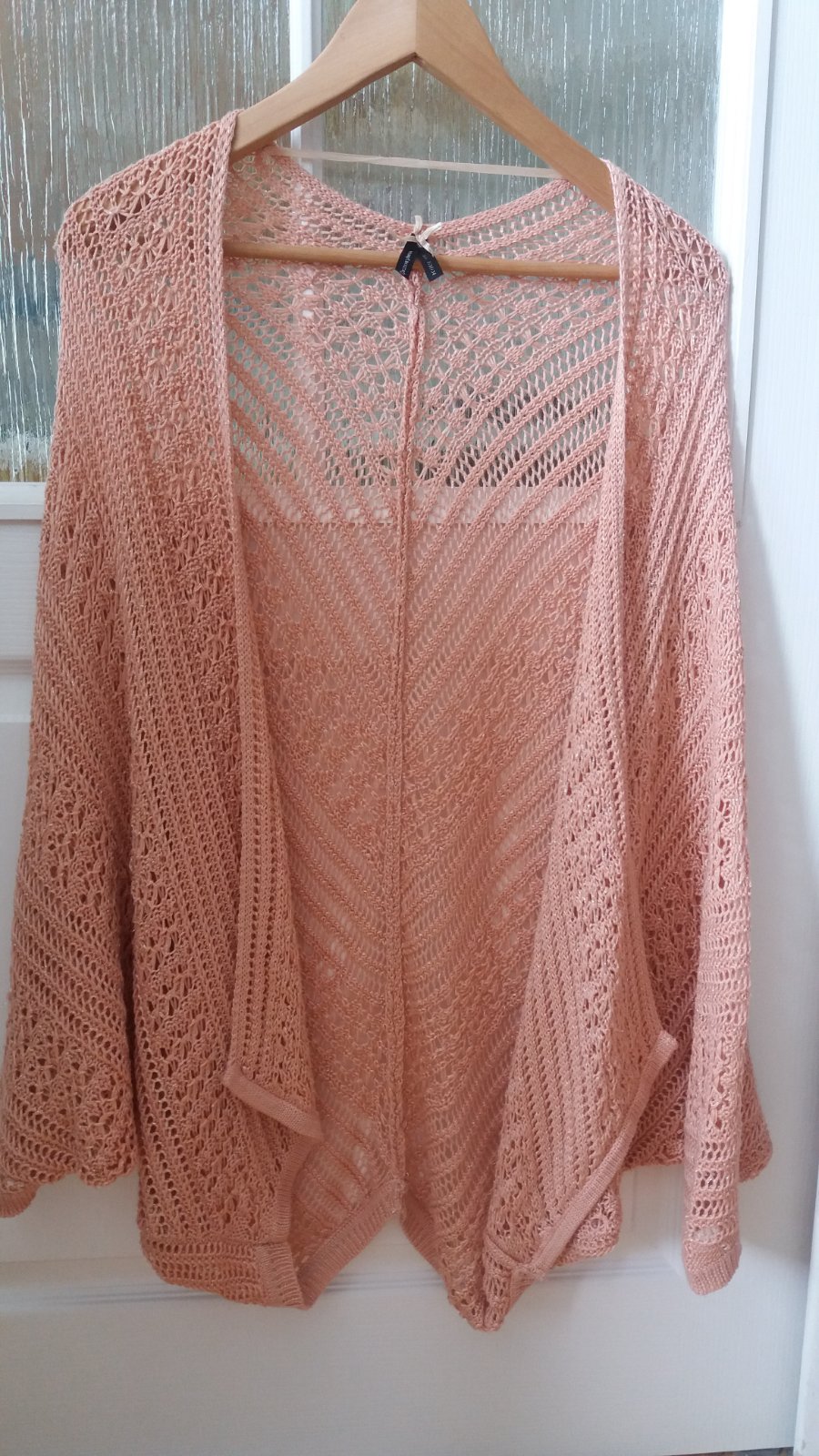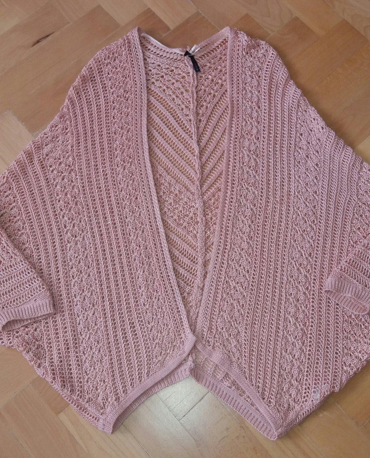 Predam noseny kardigan znacky Atmosphere, velkost 36. Velmi dobry noseny stav, sem-tam povytiahnuta nitka, snazila som sa ich priebezne "zapracovavat", ale moze sa este nejaka vyskytnut, najma ta popretkavana. Pretkavane zlatou nitou, farba taka skor do marhulova, nie ruzova. Rukavy sa dole zuzuju, vyuzila som tento kardigan hlavne pri veciach so sirokymu rukami.