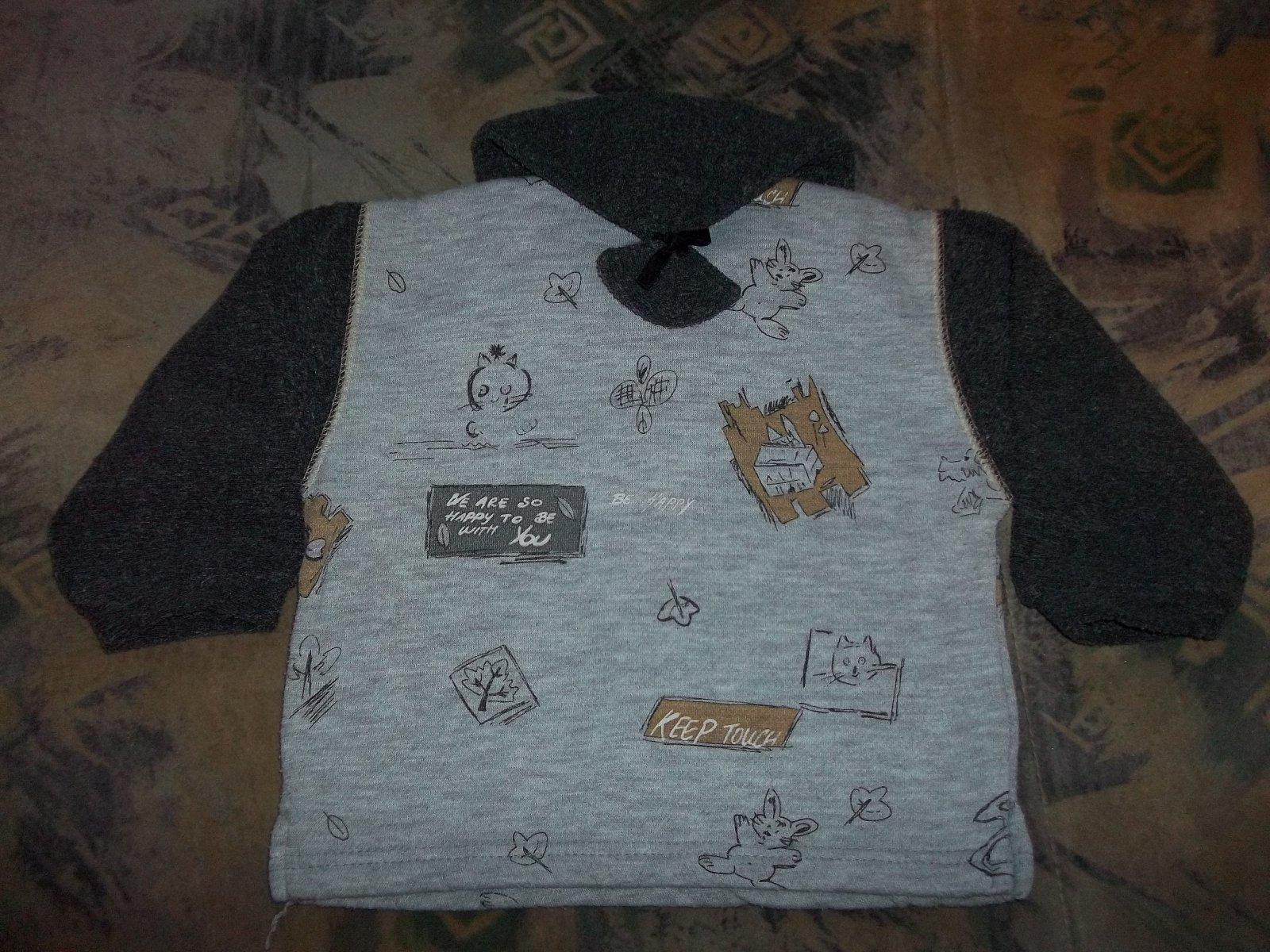 Predám šedú mikinu s dlhým rukávom. Pri krku je zapínanie na gombíky. Motív tvár mačky, zajac, listy, hrad. Žmolkové. V dobrom stave.