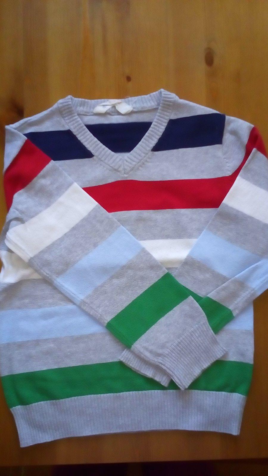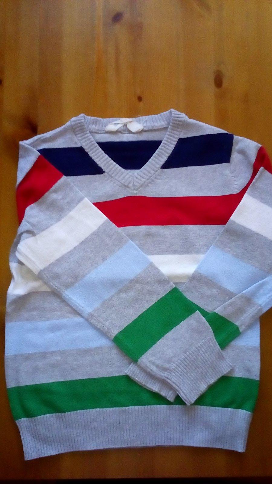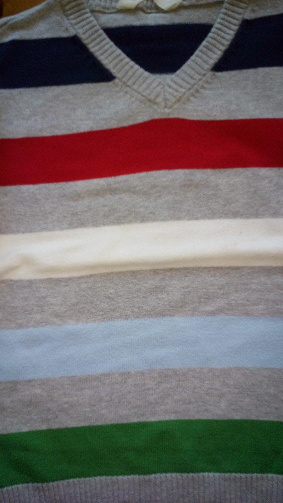 Predám veľmi pekný tenký pulóver s farebnými pásikmi s V výstrihom, veľmi pekný, bez znečistenia a známok opotrebovania. Pulóver má stálu formu, výbornú kvalitu, žiadne "žmolky", ani zatiahnutá tkanina. Výborne sa kombinuje s košeľami, polokošelami či tričkami, vhodný na jar/jeseň, nakoľko nie je hrubý.