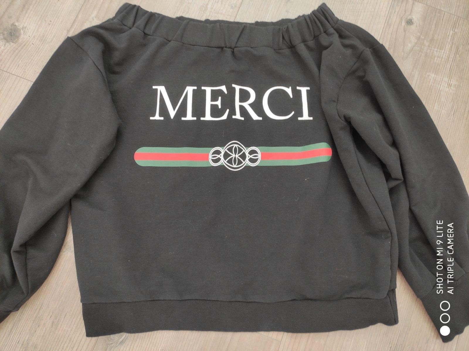 krasna 1 krat oblecena mikina s velkym napisom Merci. mikina ma vrchnu cast celu na gumicku takze by sa moze nosit spanuta na ramenach,ale vyzera velmi pekne aj klasicky oblecena v tom pripade je ale kratsia . velkost UNI sadne max do velkosti M