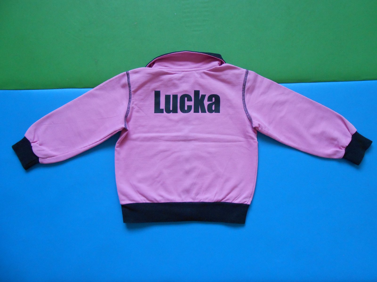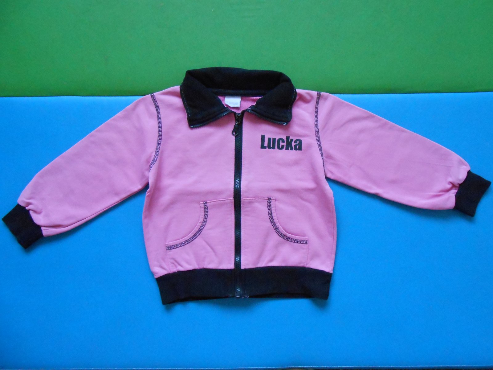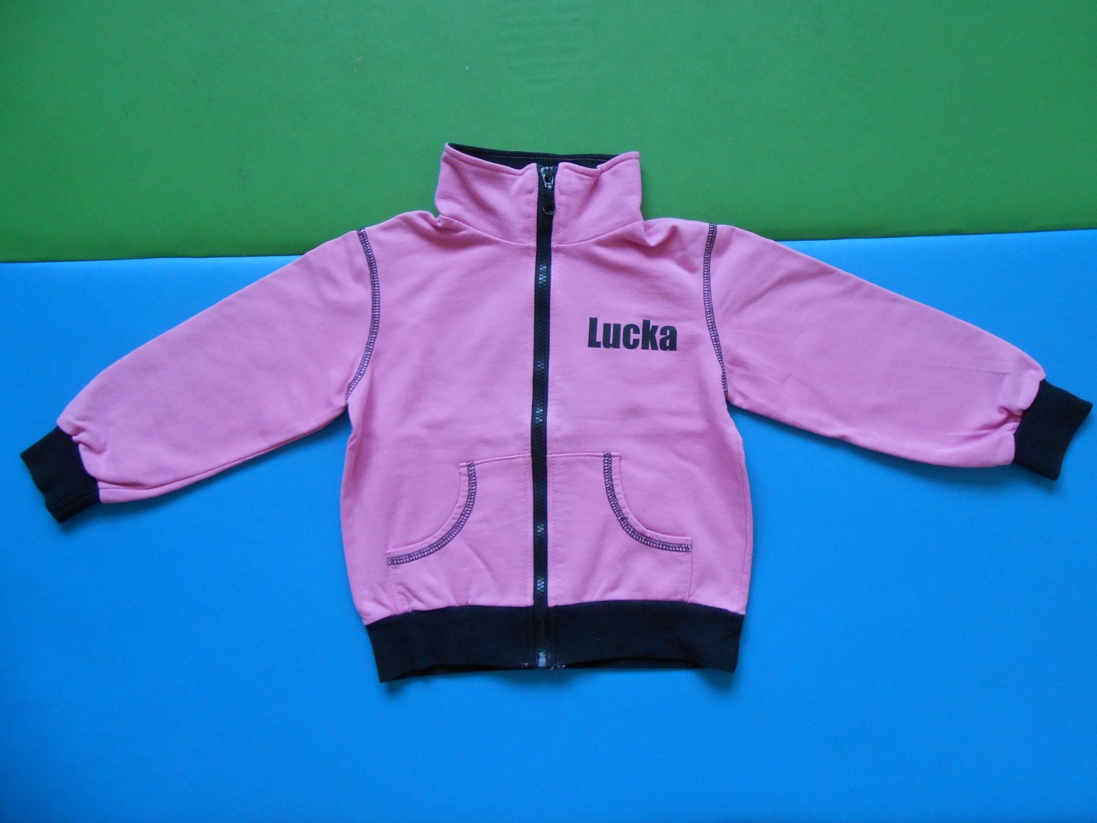 Mikina z kvalitnej bavlny pre dievčatko s menom LUCKA. Šetrili sme si ju, no aj tak má na rukáve 1 bledý fliačik (viď posledná fotka). Vždy, keď sme ju mali oblečenú, bodovali sme :-) Mikina je na zips, golier dobre kryje krk pred vetrom, ocenili sme aj patenty na rukávoch. Jedna z najlepších mikín, aké sme doteraz mali.