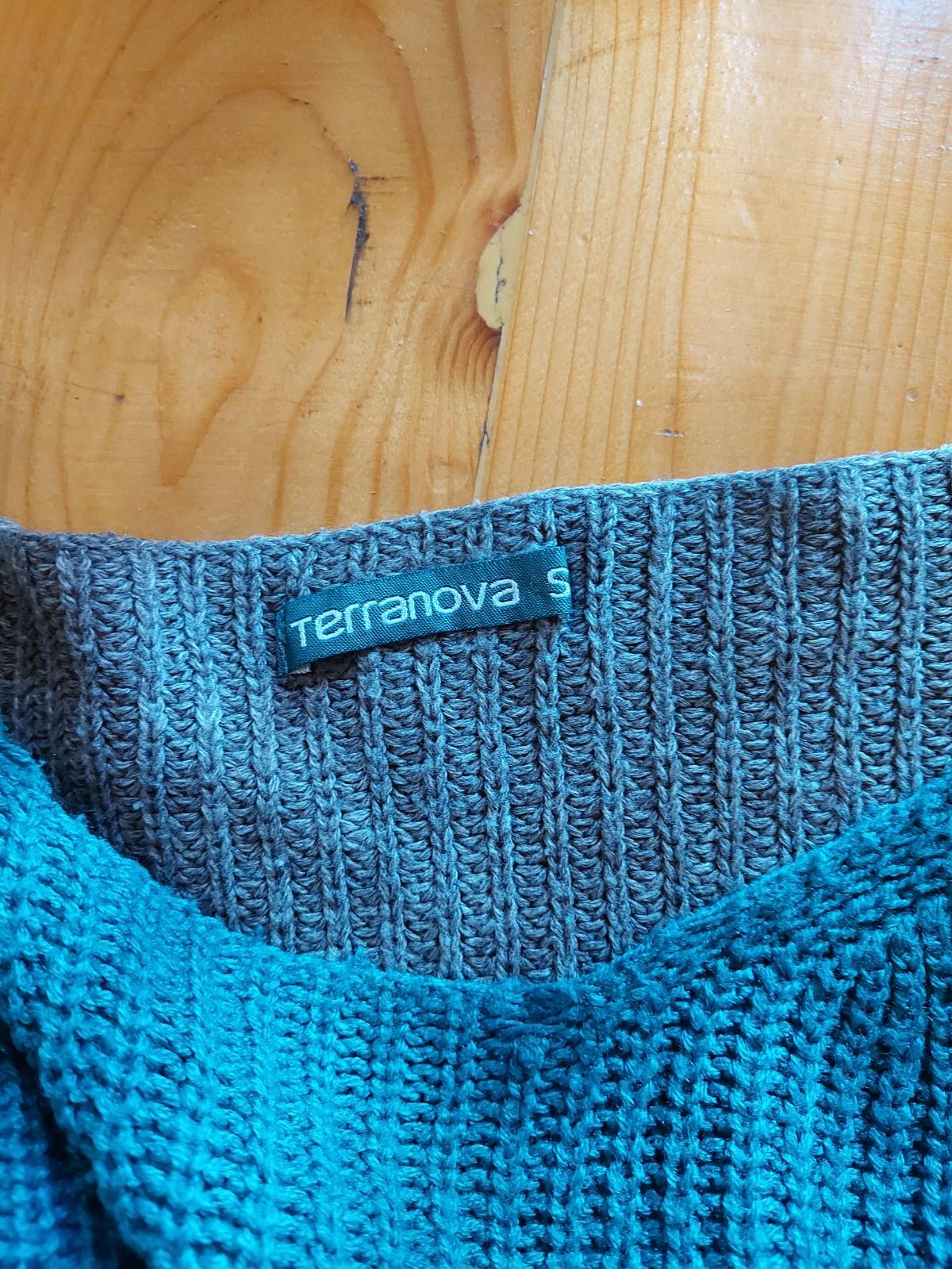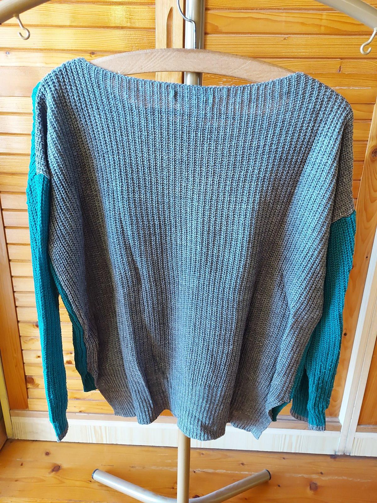 Zeleno-šedý pulóver Terranova S, aj M, voľný strih, vpredu zeleny, vzadu šedý-viď foto, š. pod pazuchami v kľude-61, d. zadného dielu-53, d. rukávu 43