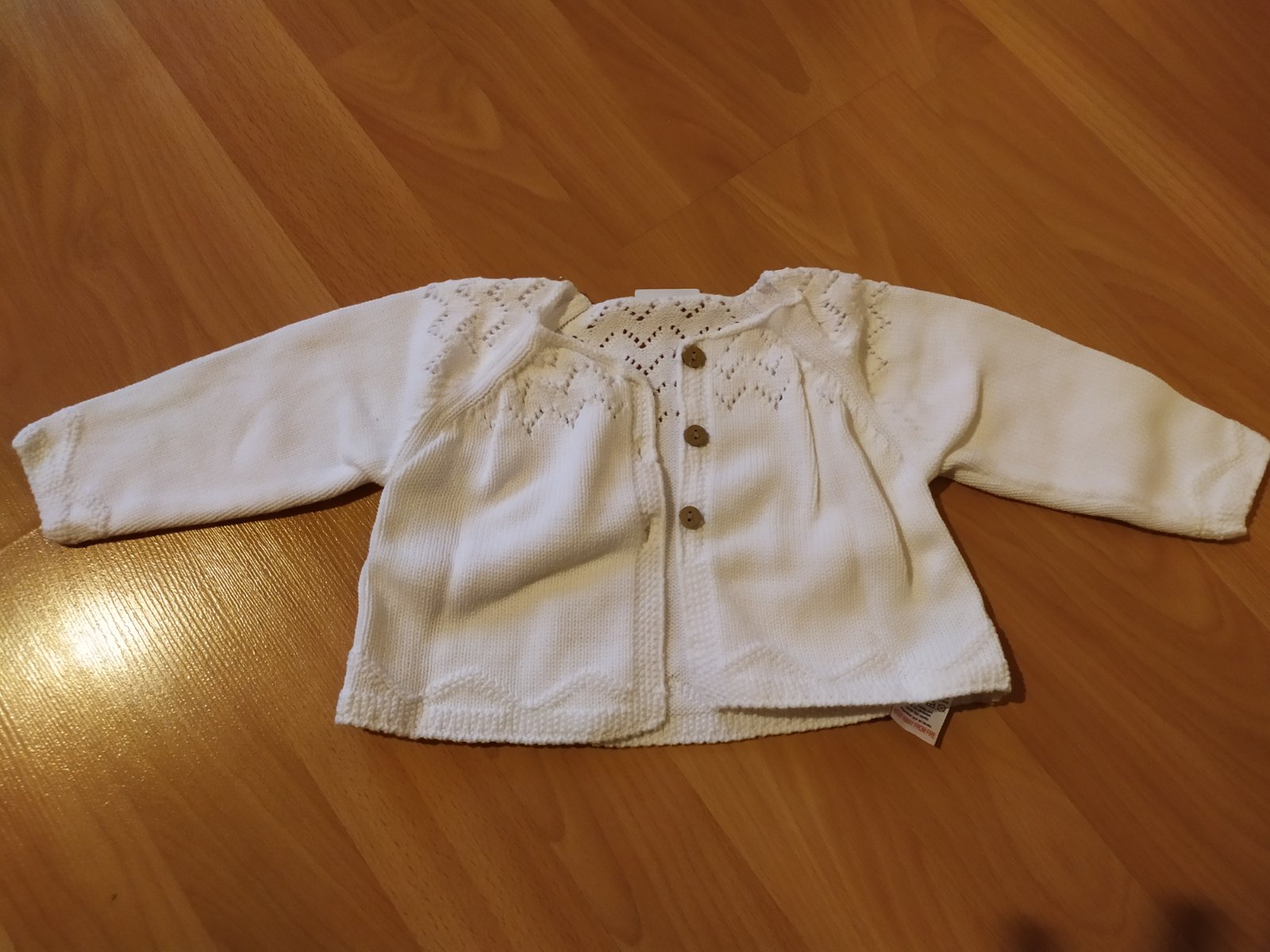 Krásny biely svetrik Next veľkosť 9-12m (cca 68-74), kupovaný na MK len kvôli svadbe. Z jedného gombika kúsok chyba, nevidno.