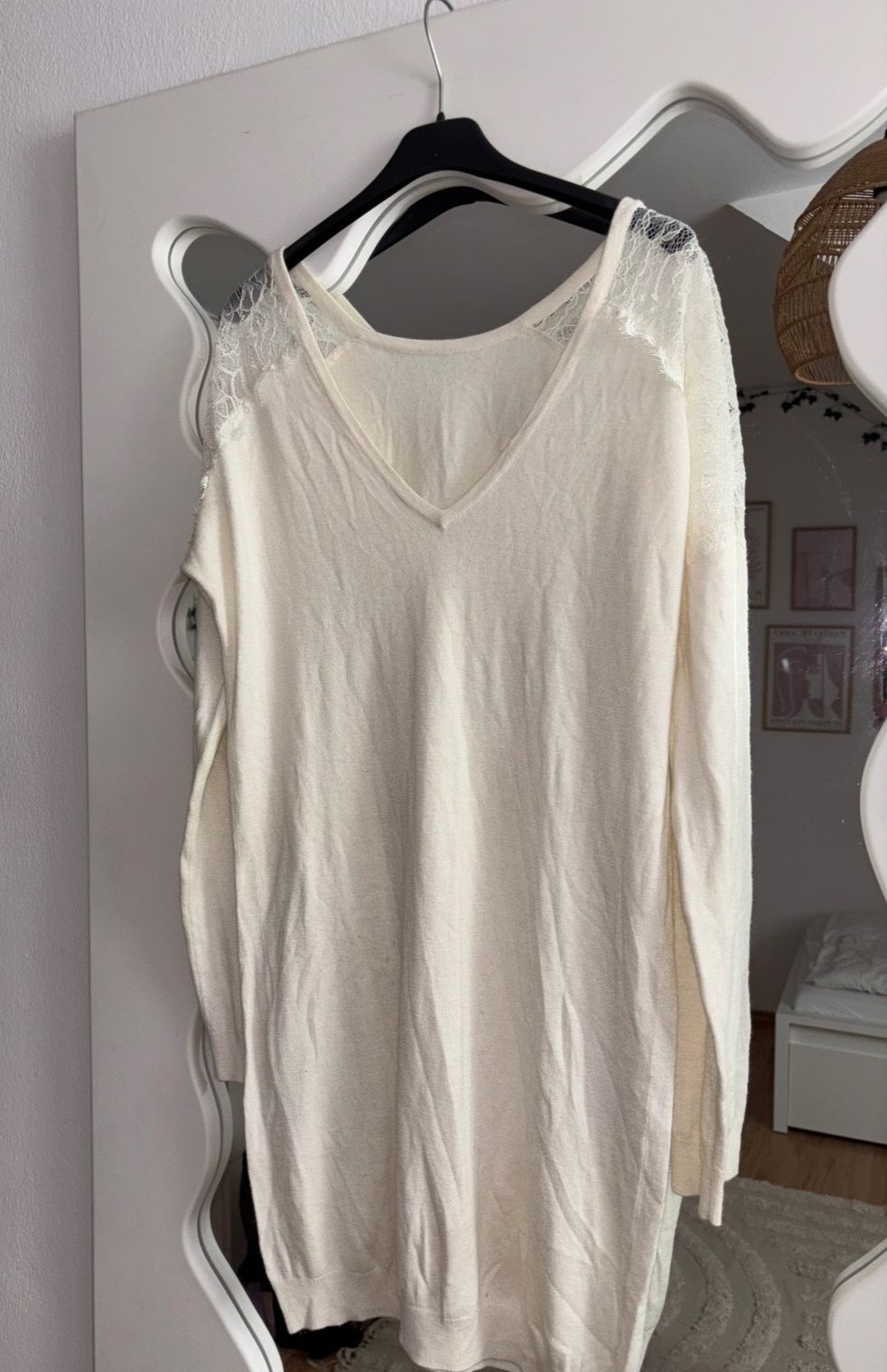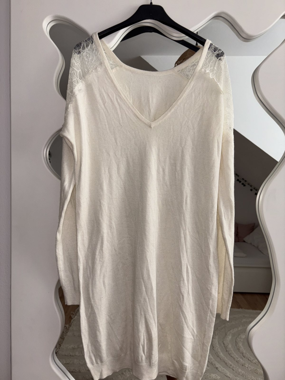 bez známok nosenia,jemný úplet,V-výstrih môže byť vpredu aj vzadu,odstrihnutý štítok,sedí na 38/40,š.50 cm,d.84 cm