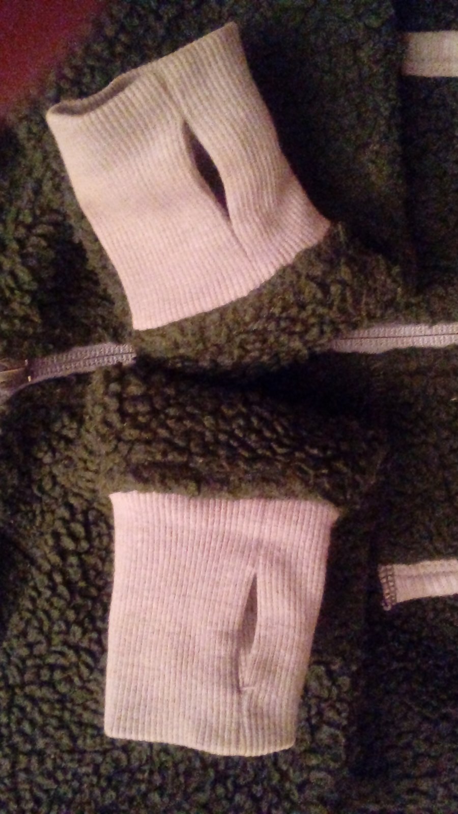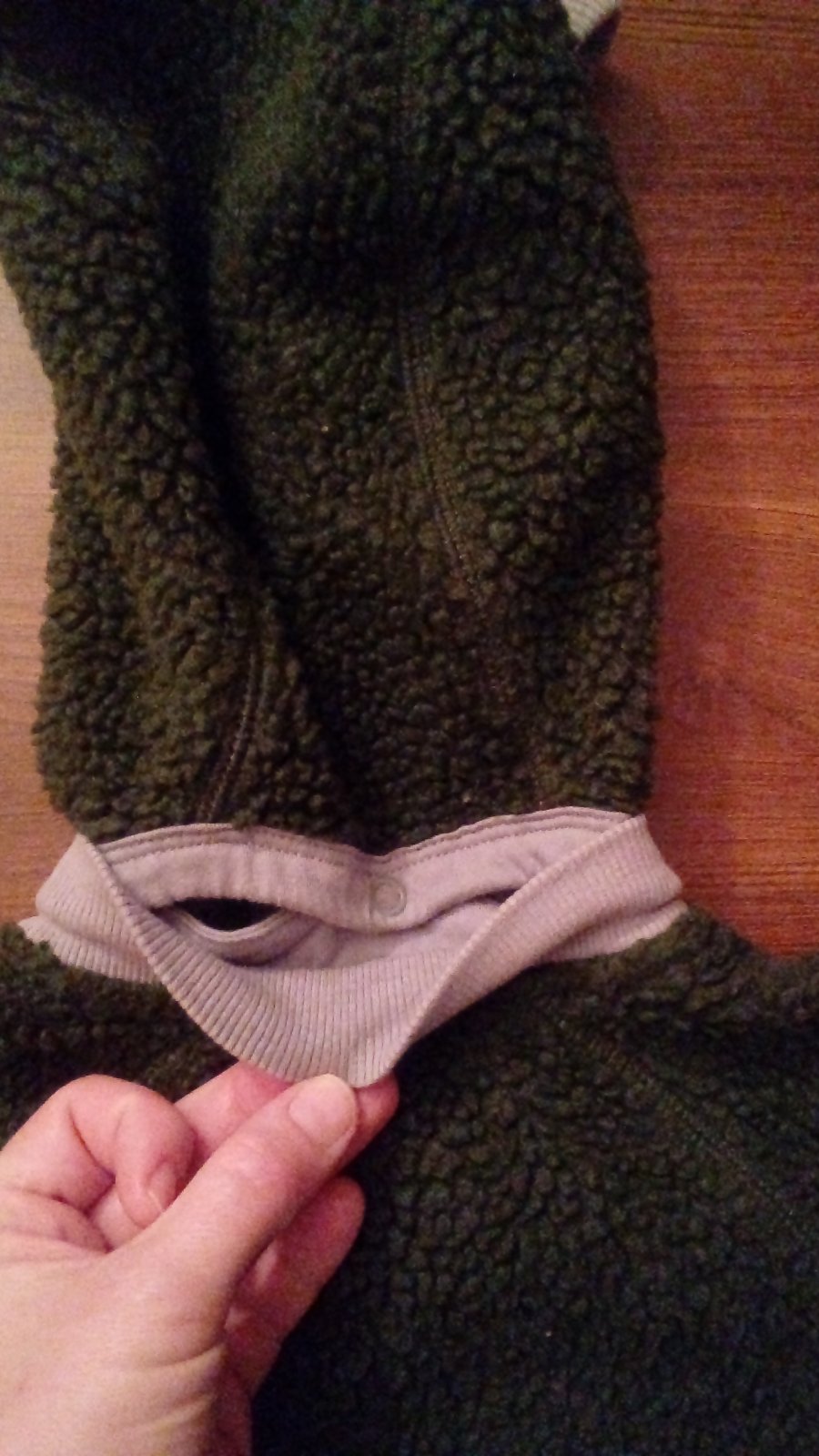 Kapucna sa da odopnut a manzety na rukavoch maju otvory na palce (sluzia ako rukavice)