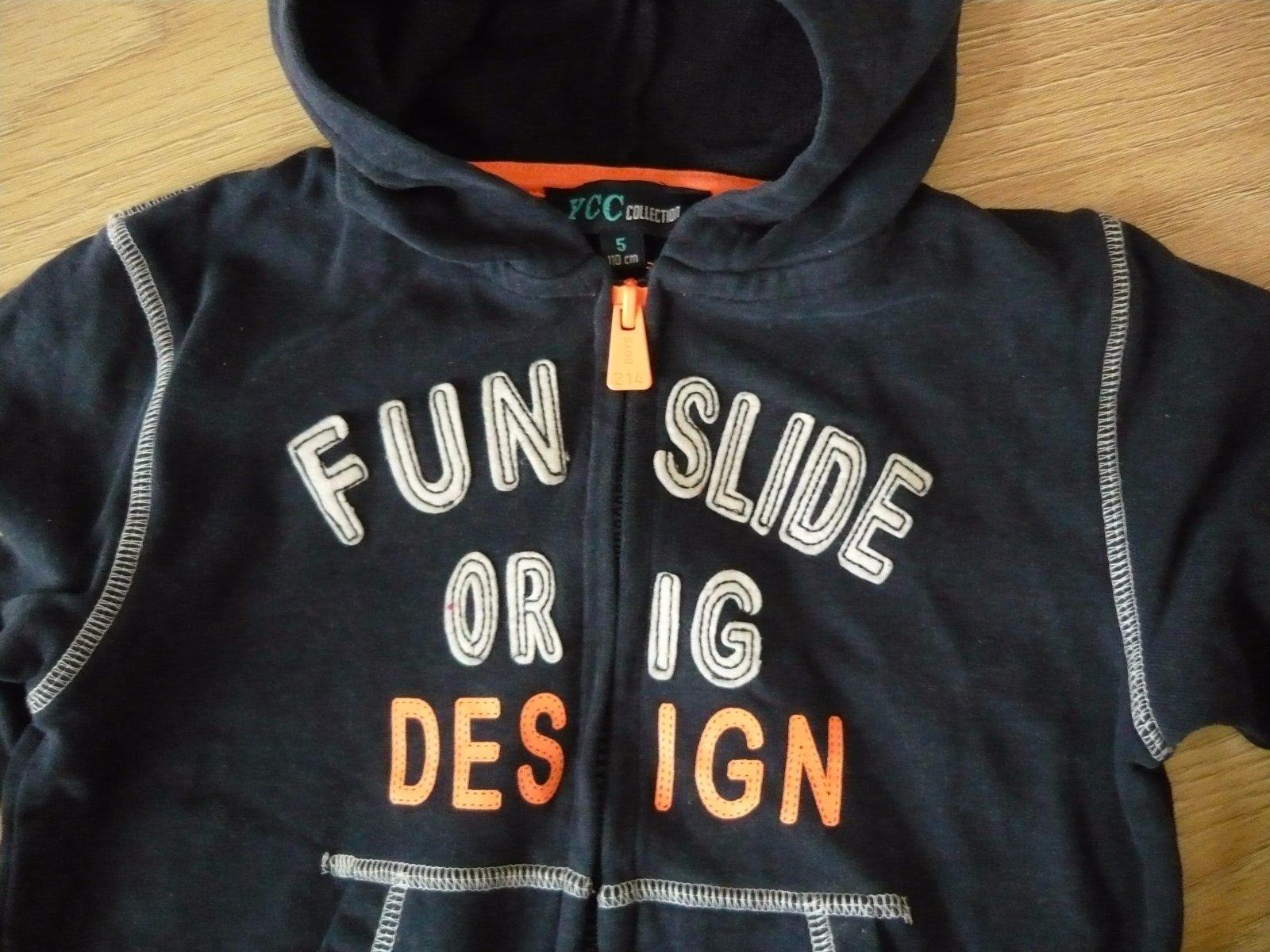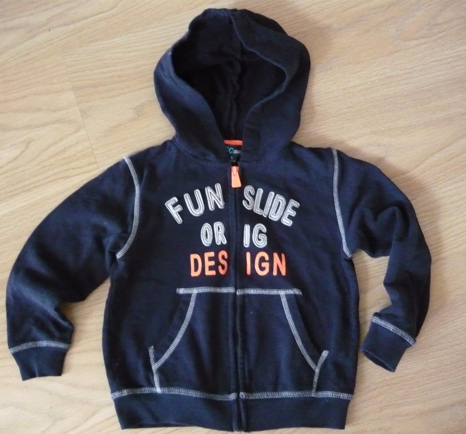 Frajerská mikina s kapucňou, kvalitná 100 % bavlna, v perfektnom stave, skoro nenosená. Veľkosť je uvedená 110 - pre 5 ročných, ale podľa mňa je to 98 / 104.