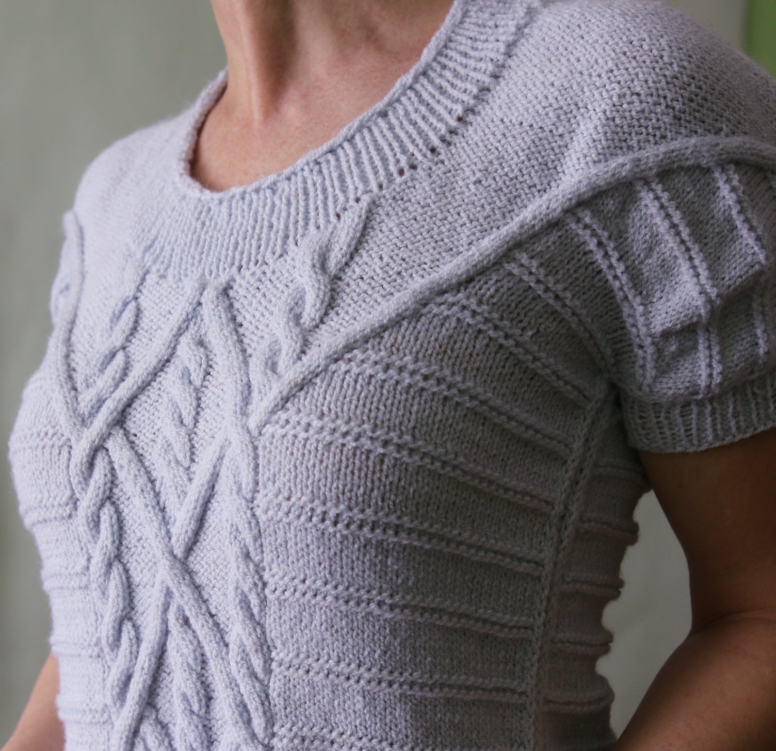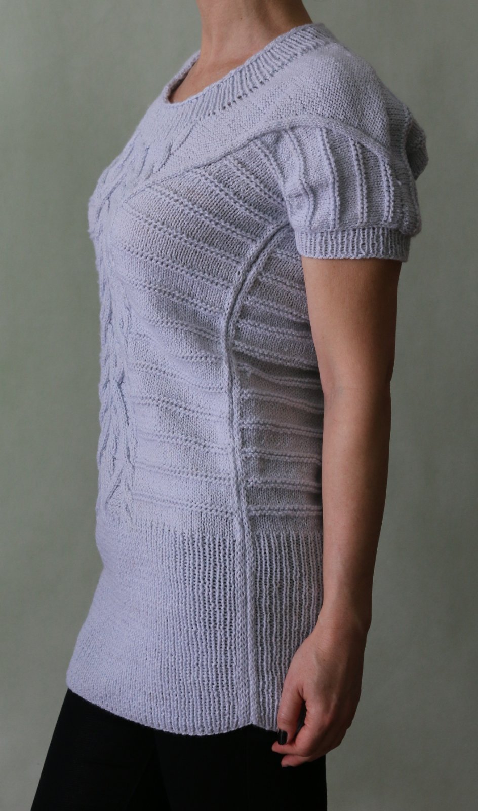 Strih svetra je vybraný a dlhší, takže sa hodí najmä k slim a skinny nohaviciam anebo na legíny. Vďaka vysokému pružnému lemu na dolnom okraji a okolo výstrihu sveter pekne kopíruje postavu. Rukávy sú mierne nabrané, stiahnuté do pružného lemu. Predok svetra je bohato vypletaný vertikálnym osmičkovým vzorom, jednotlivé diely svetra sú zošité výrazným ozdobným stehom. Veľkosť svetra odhadujem na 40. Predná čast vďaka osmičkám pôsobí užšia, ale sveter je veľmi pružný. Fotka na postave 36.