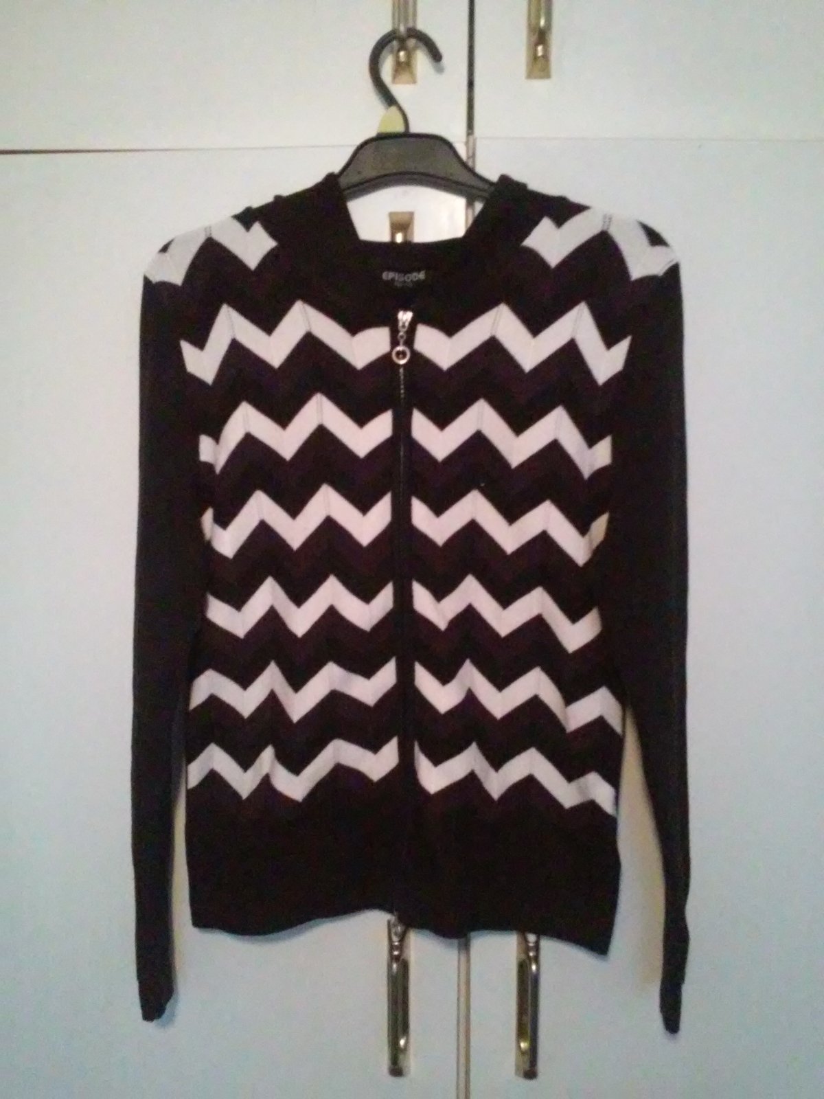 Predám sveter s kapucňou, ktorý nebol ani raz oblečený. Chrbát svetra a rukávy sú čierne, predná časť je bielo-čierno-fialová. Je na zips, pôsobí veľmi mladistvo.