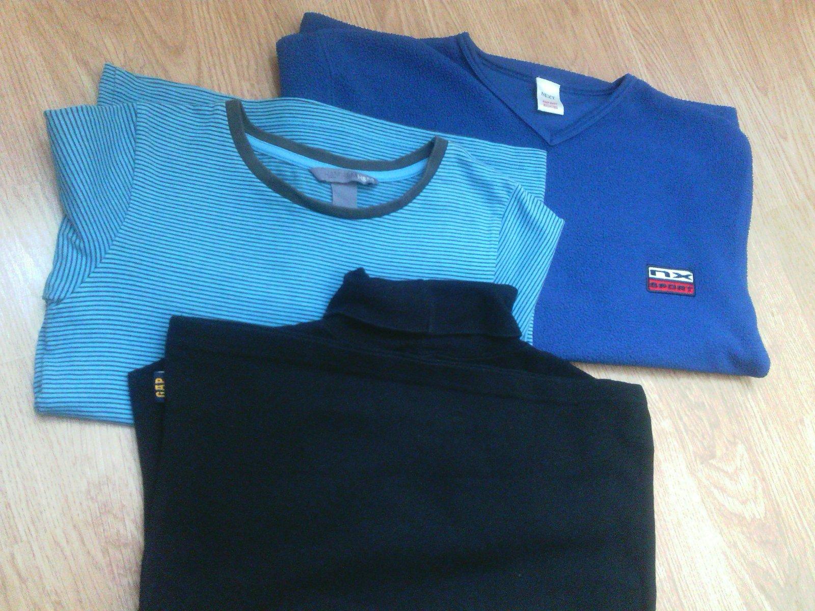 Flísová mikinka next dĺžka 51cm,šírka 43cm,pranie už poznať na flise, čierny rolák gap, dĺžka 47cm,šírka 41cm,tricko hm dĺžka 46cm,šírka 36cm,vecičky majú bežné známky nosenia a prania, cena spolu je 3€+pošta nad 500g