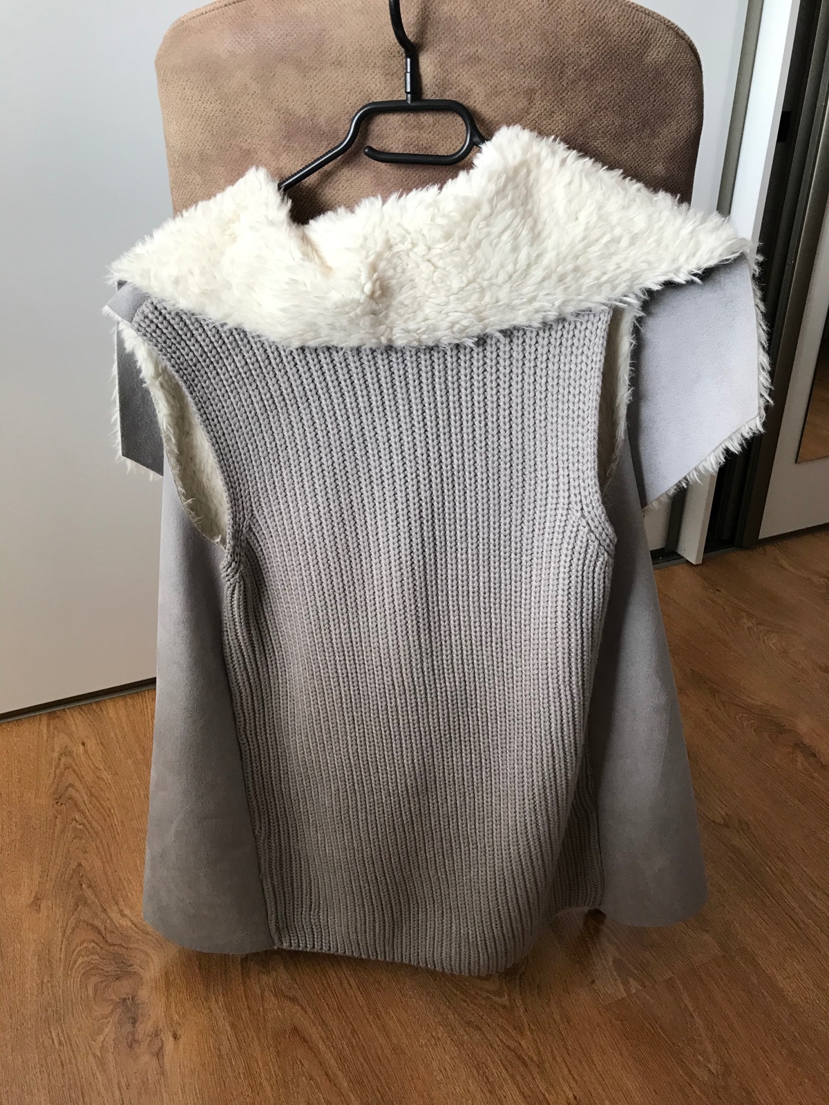 Krásna akoby semišová vesta, zapínanie v páse opaskom, predĺžená, veľmi pekne formuje postavu. Farba bledosiva, bez poškodeni, veľmi pekný stav. Dlzka 90 cm, šírka v prsiach 46 cm. Mam v rovnakej v...