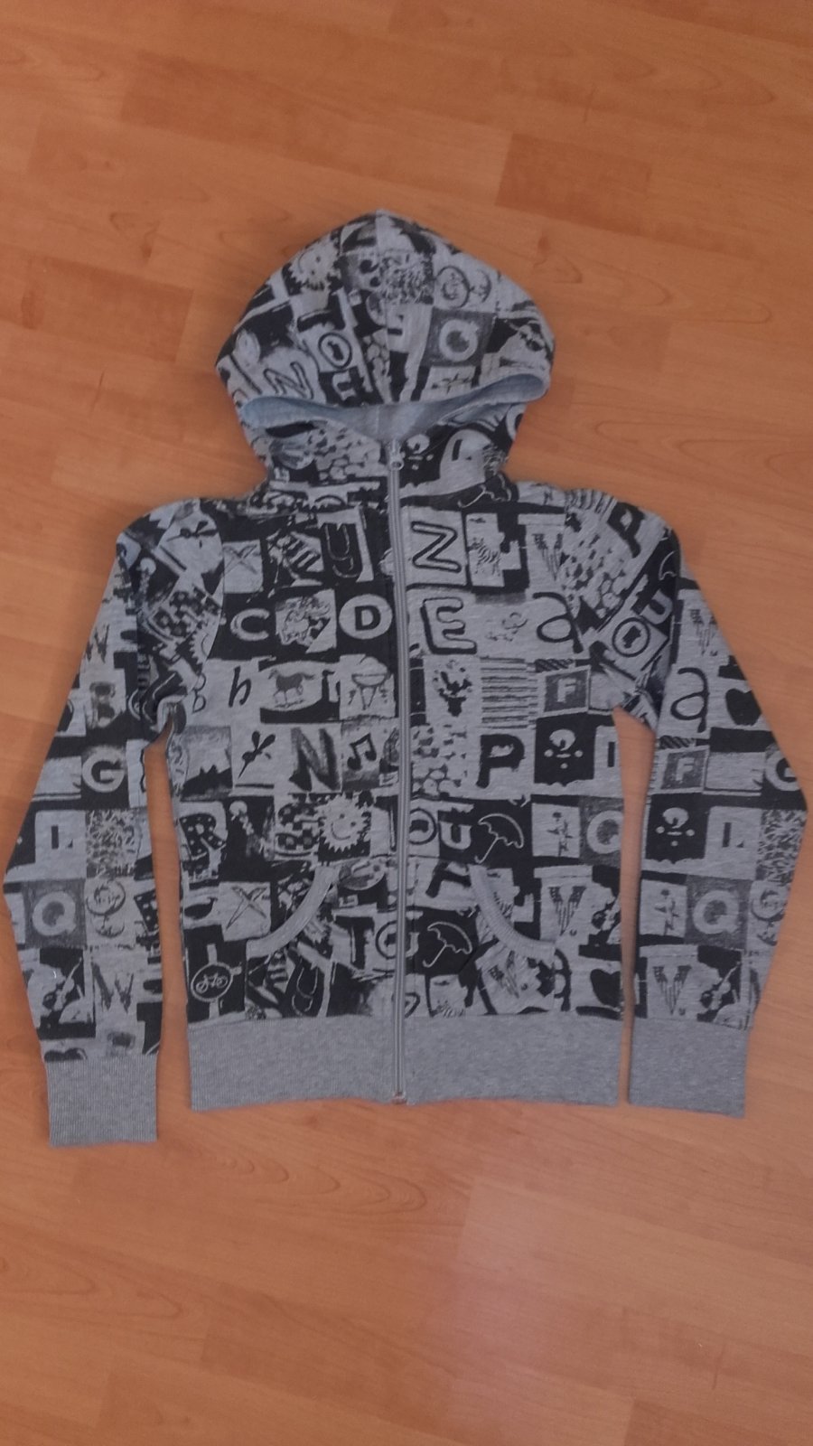 1. Šedá H&M, je tam č. 152, ale je oveľa menšia, viď. miery. Nosená, asi 2 zašité dierky, čo pri tomto vzore ani nevidno.