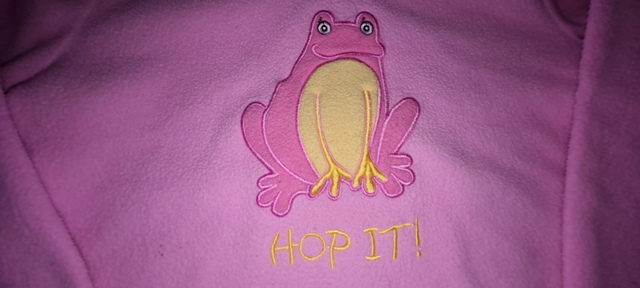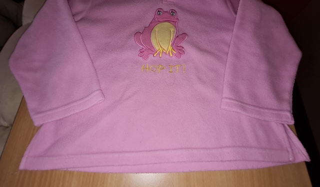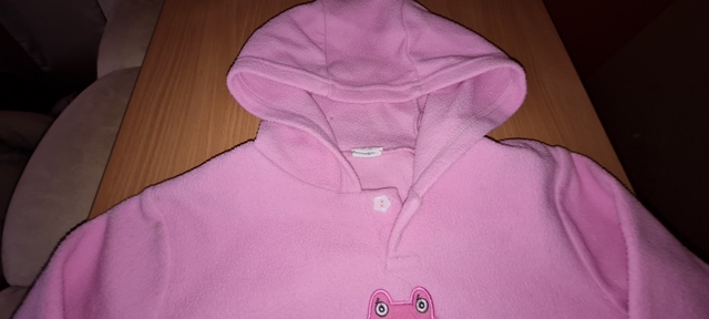ružová flísová mikina, s kapuckou, vpredu nášivka žaby, zloženie bavlna, po bokoch rozparky, 1 gombík pri výstrihu, perfektný stav
