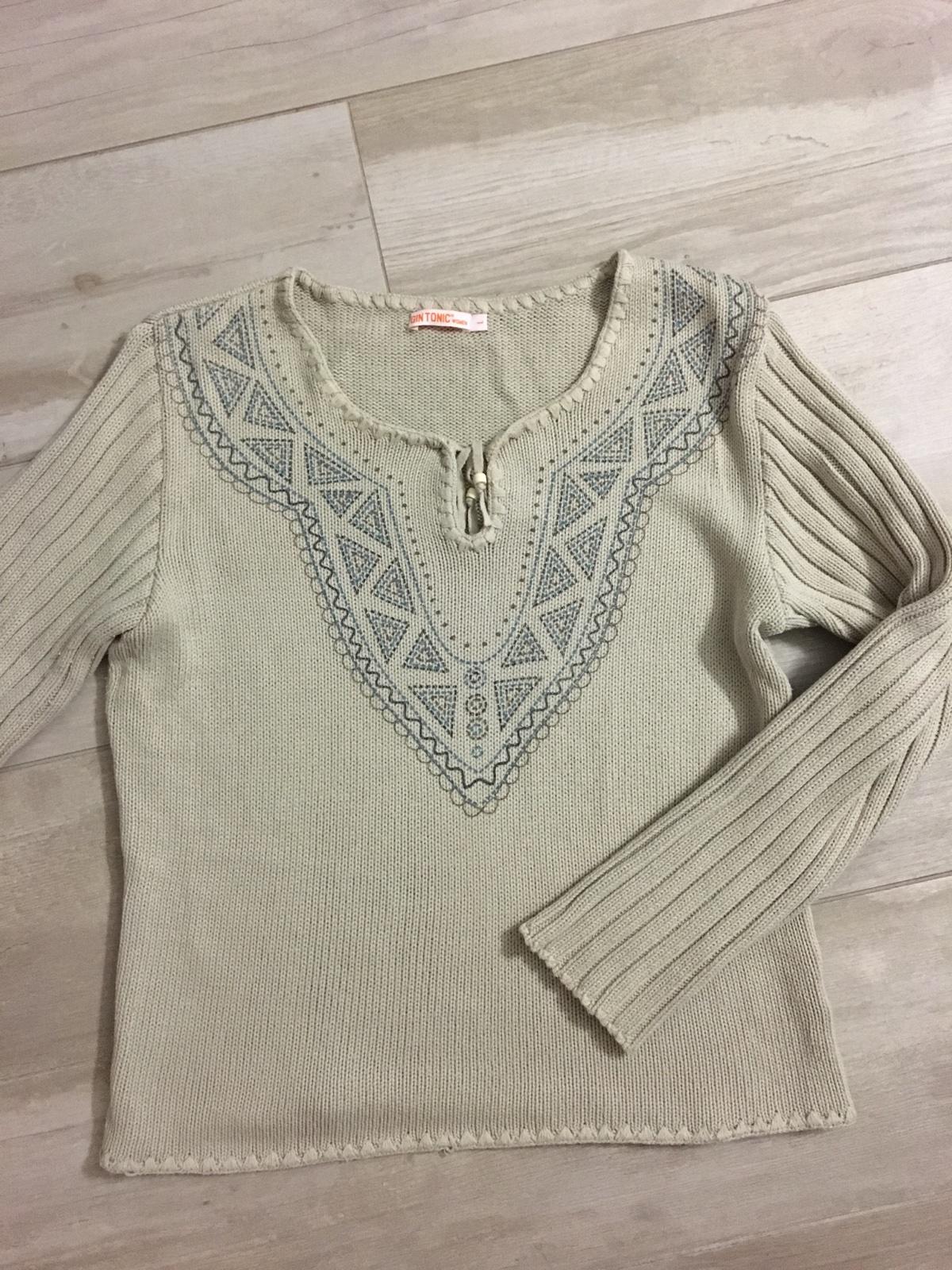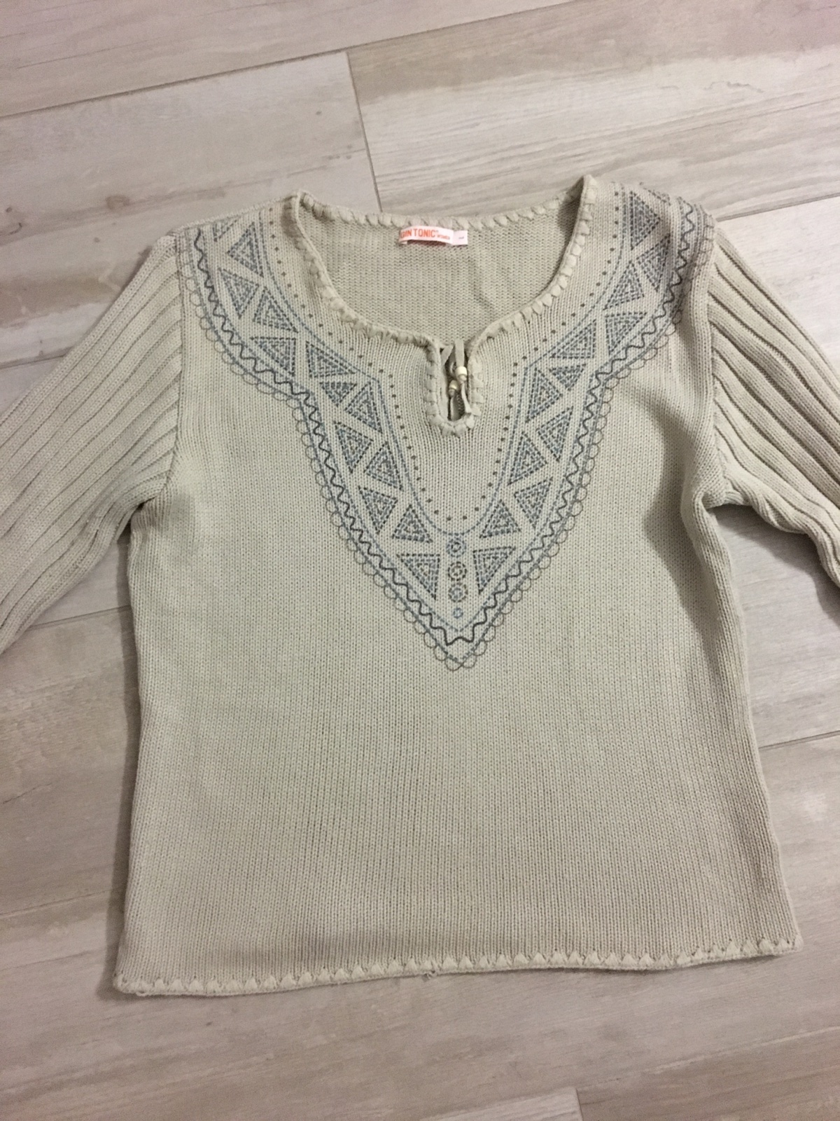 Zn. GIN TONIC, svetrík má sotva viditelné stopy nosenia, na niektorých miestach má mini žmolky, kroré idú odžmolkovať. Je fakt nádherný, smotanový s hnedo tyrkysovým lemovaním, Veľ: L, d: 57 cm, š 46 cm x2, r: 60 cm
