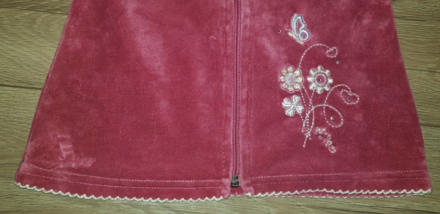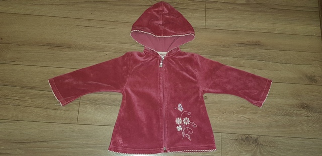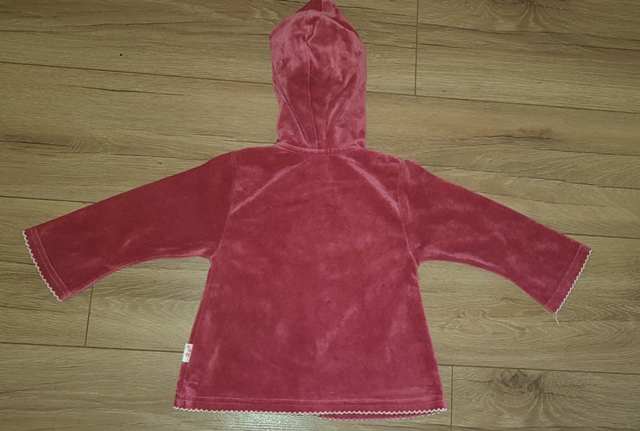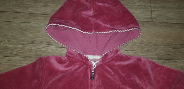 flísová, okraje obšité bielou niťou, má kapucňu, vpredu zips a nášivka, nosená v perfektnom stave