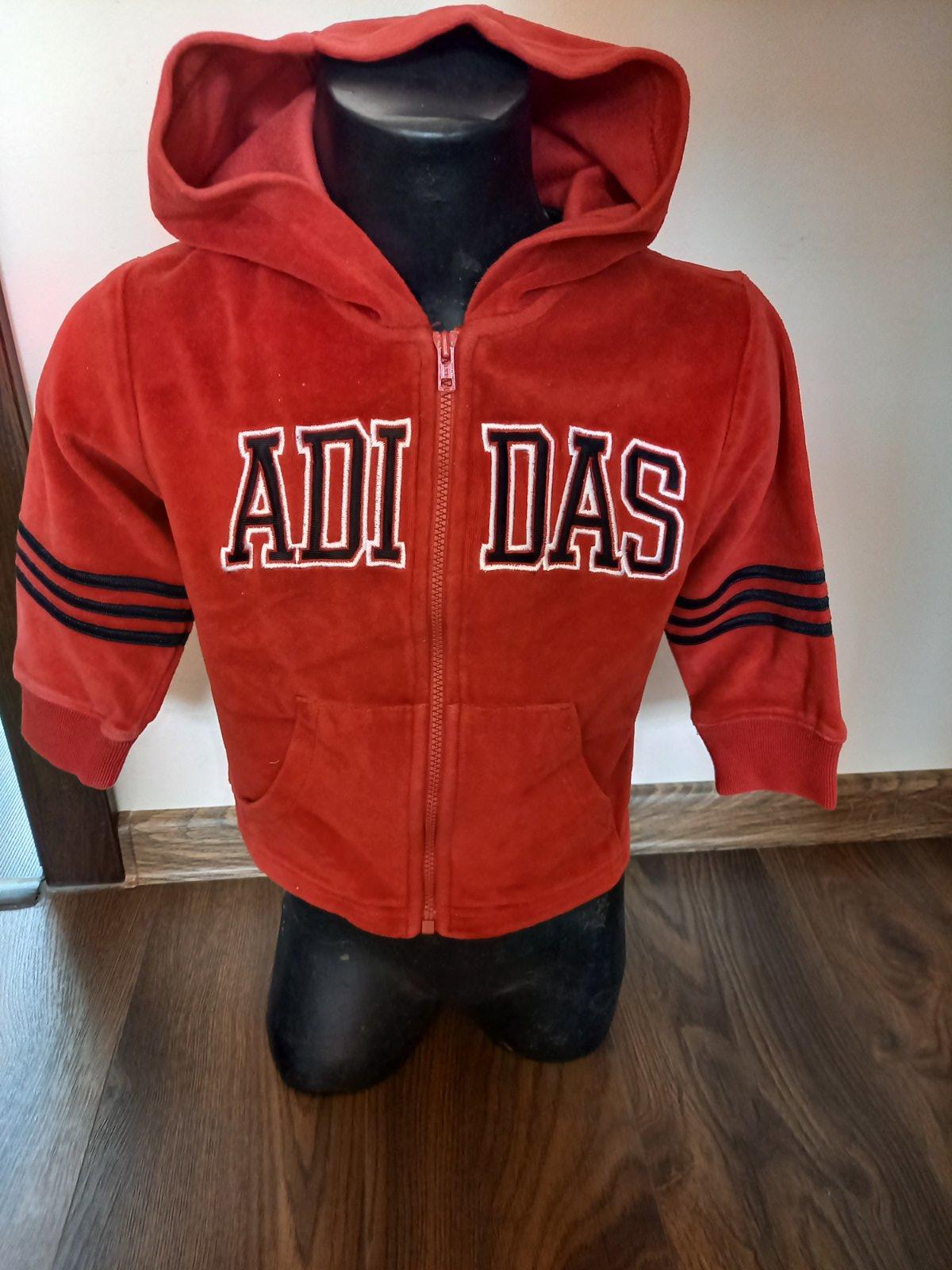 Červená bunda s kapucnou sytej červenej farby, 76 percent bavlna a 24 percent polyester, píše velkost 18 mes. / my sme nosili dlhšie/, cena 4 eura