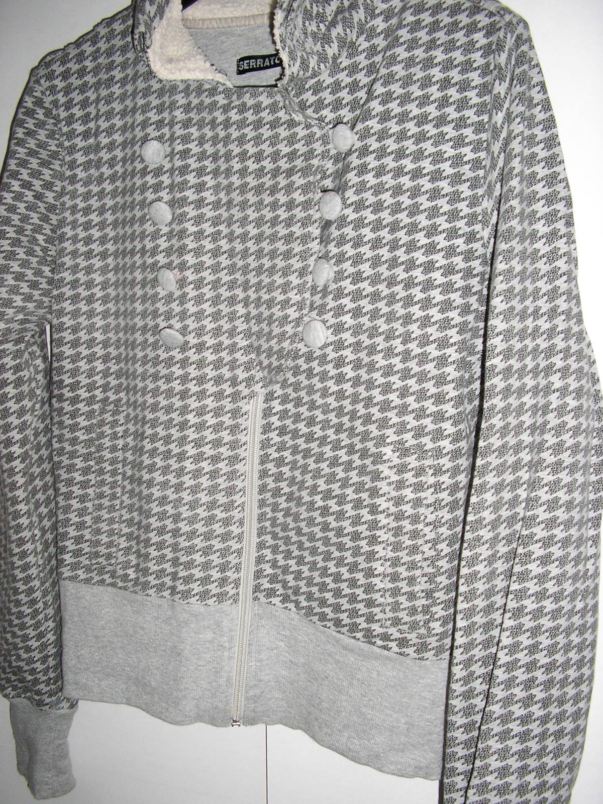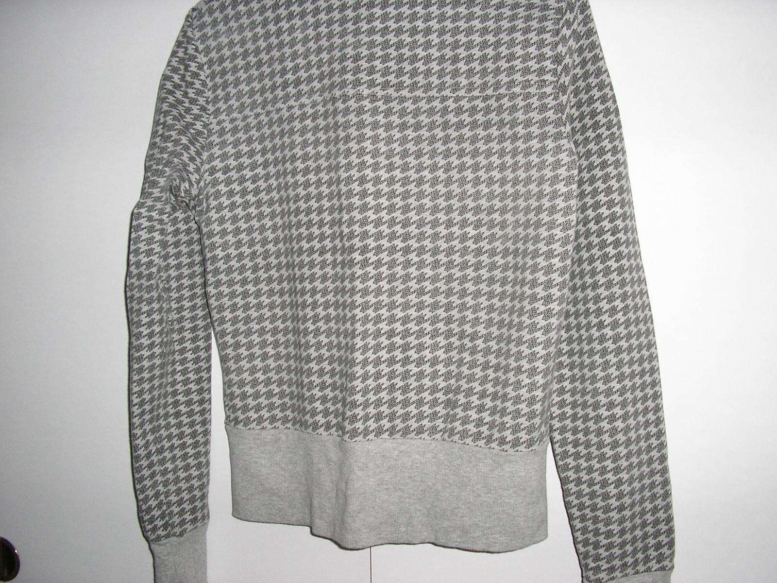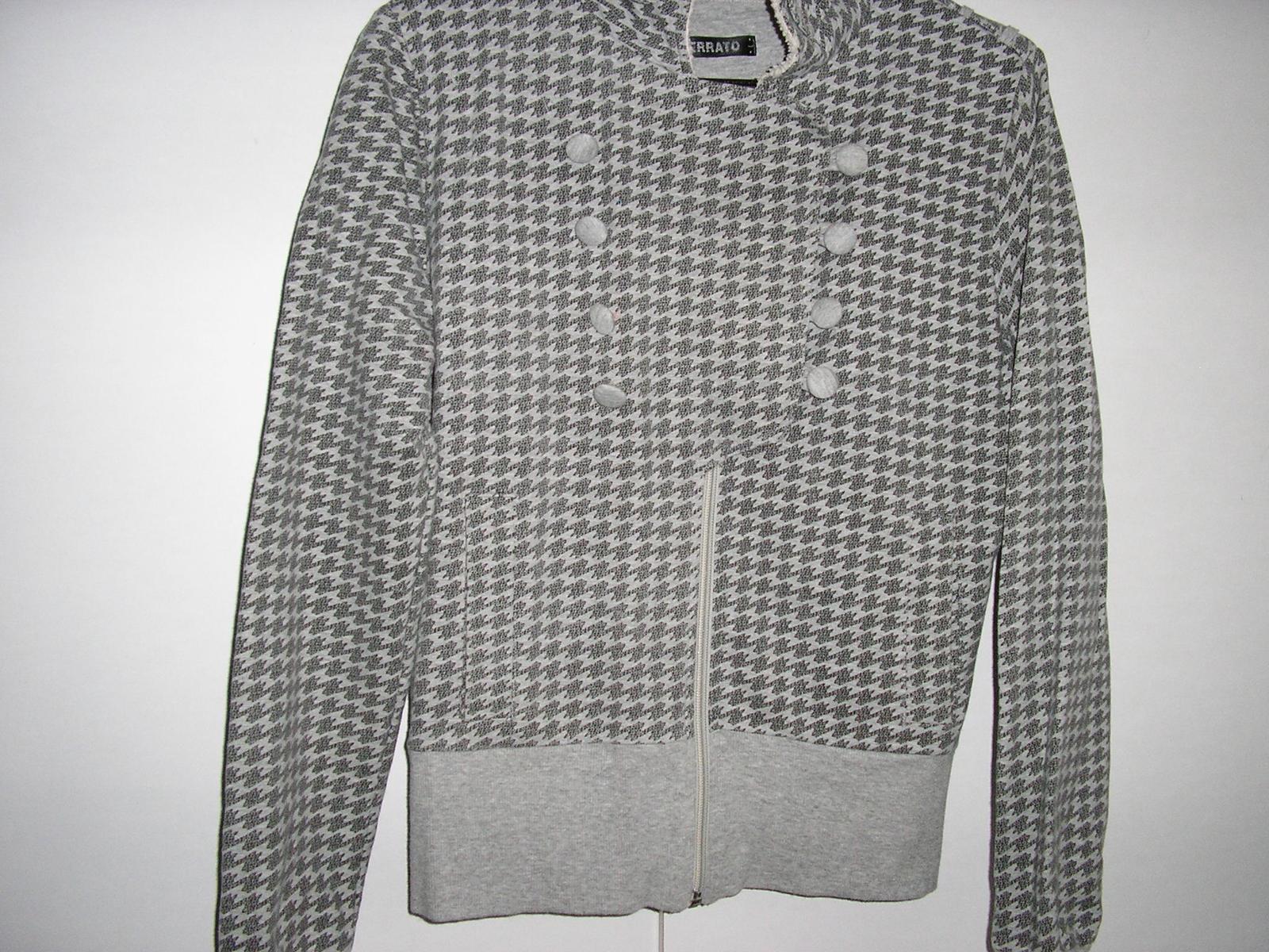 Mikina s dlhým rukávom. Farba sv. sivá ++ tm. sivá. Golier – stojačík. Zapínanie na zips + gombíky - nevšedné riešenie. Športová elegancia. Golier, spodok svetra a zakončenie rukávov sú jednofarebné – sivé, z pružného materiálu.