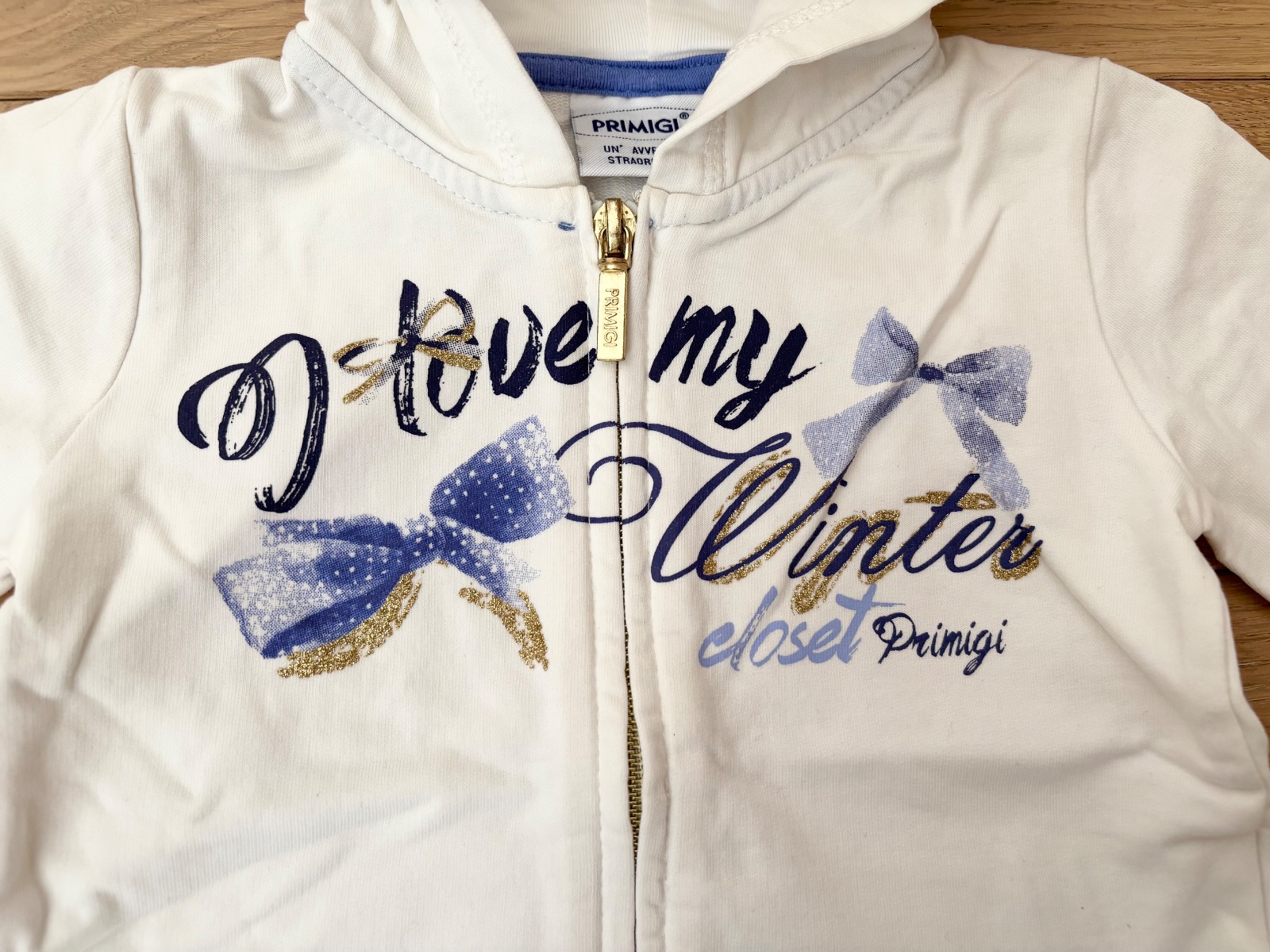 Predĺžená mikina značky Primigi s obojstranným zipsom. Veľkosť 76 / 12 M Dĺžka 35 cm