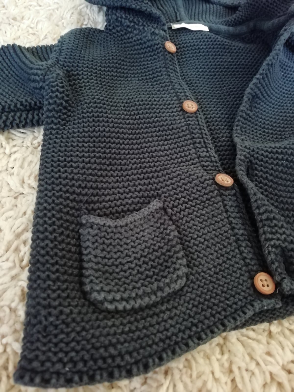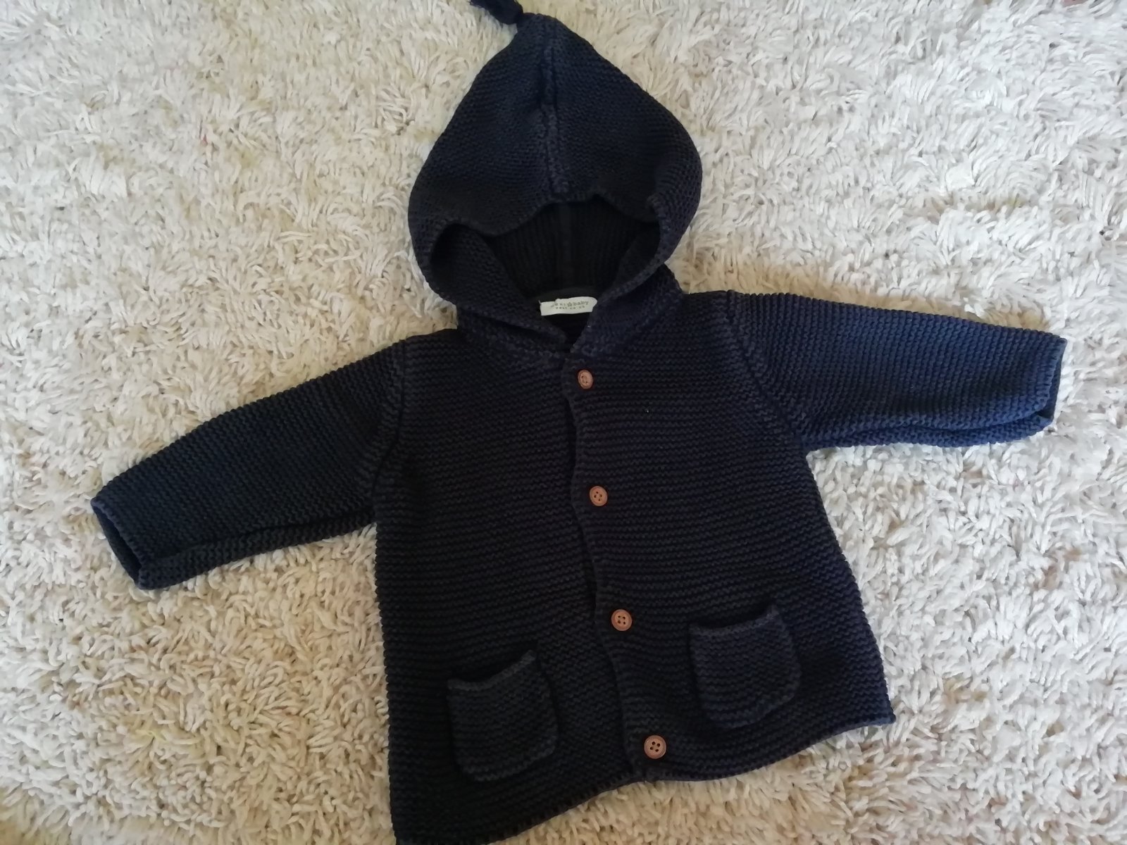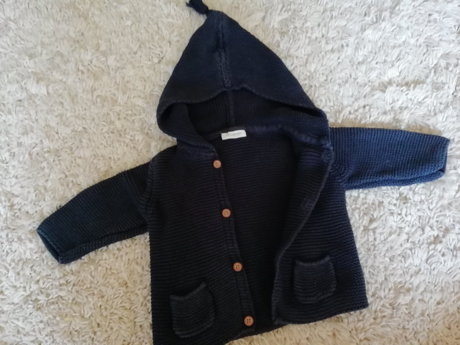 Tmavomodry svetrík na gombíky s kapucňou, značka Next, veľkosť písaná 3-6mesiacov. Jemne vyblednuta farba, inak super stav. Ešte parádu narobí.