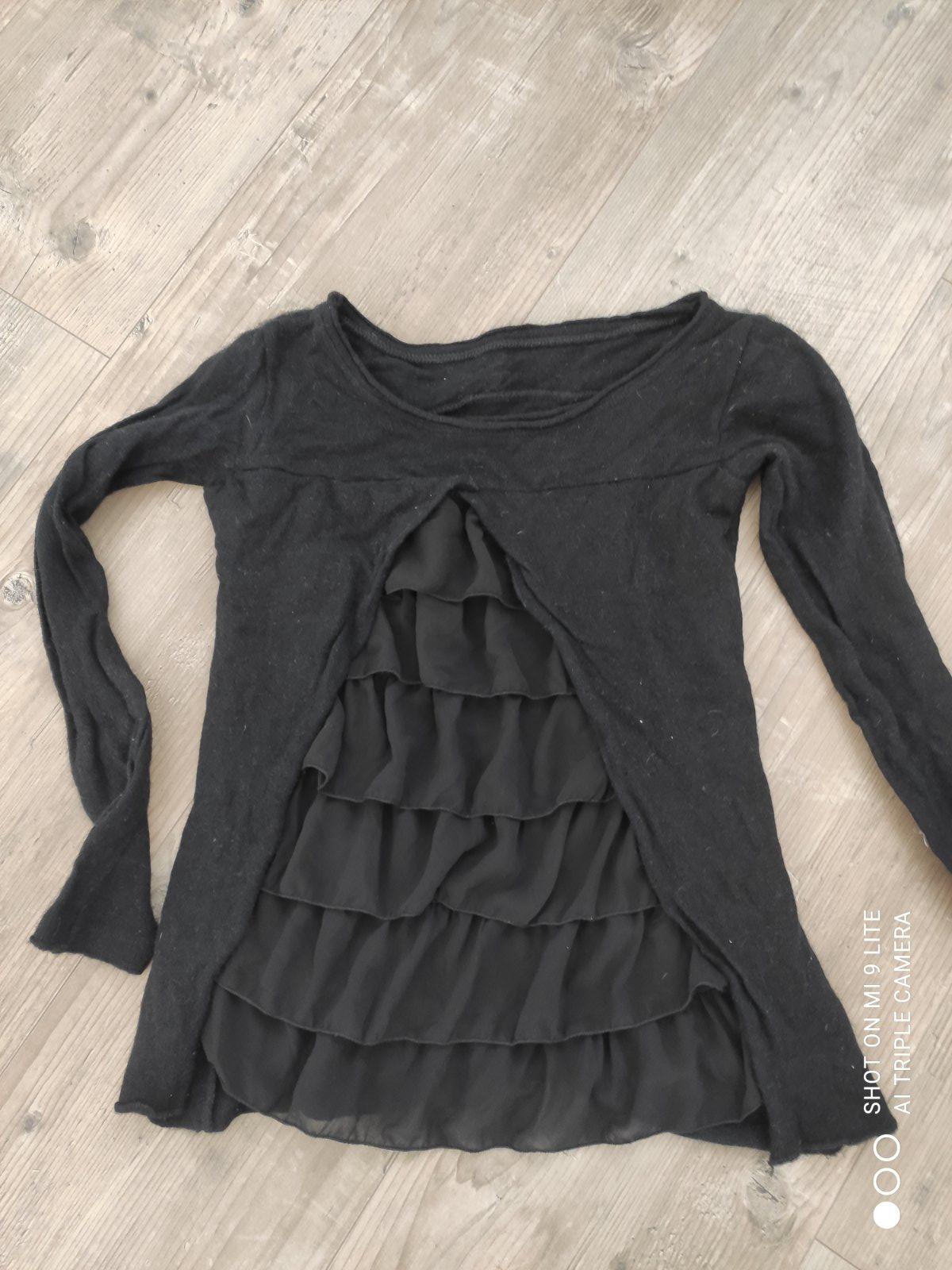makkucky cierny pulovrik s volanikmi tie mozete mat bud na prednej alebo na zadnej strane, je na vas akos a vam bude pacit viac. makkucky pulovrik tory nepicha. velkost S . velmi malo noseny v perfektnom stave