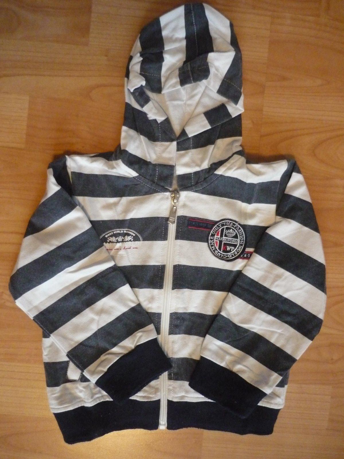 Predám tenkú mikinu, veľkosť na 24 mesiacov. Je v dobrom stave, nezatrhnutá, bez dierok a bez fľakov. Modré pásy vyzerajú ako vyblednuté ale to hneď od kúpenia. Patenty sú krásne sýto modré.