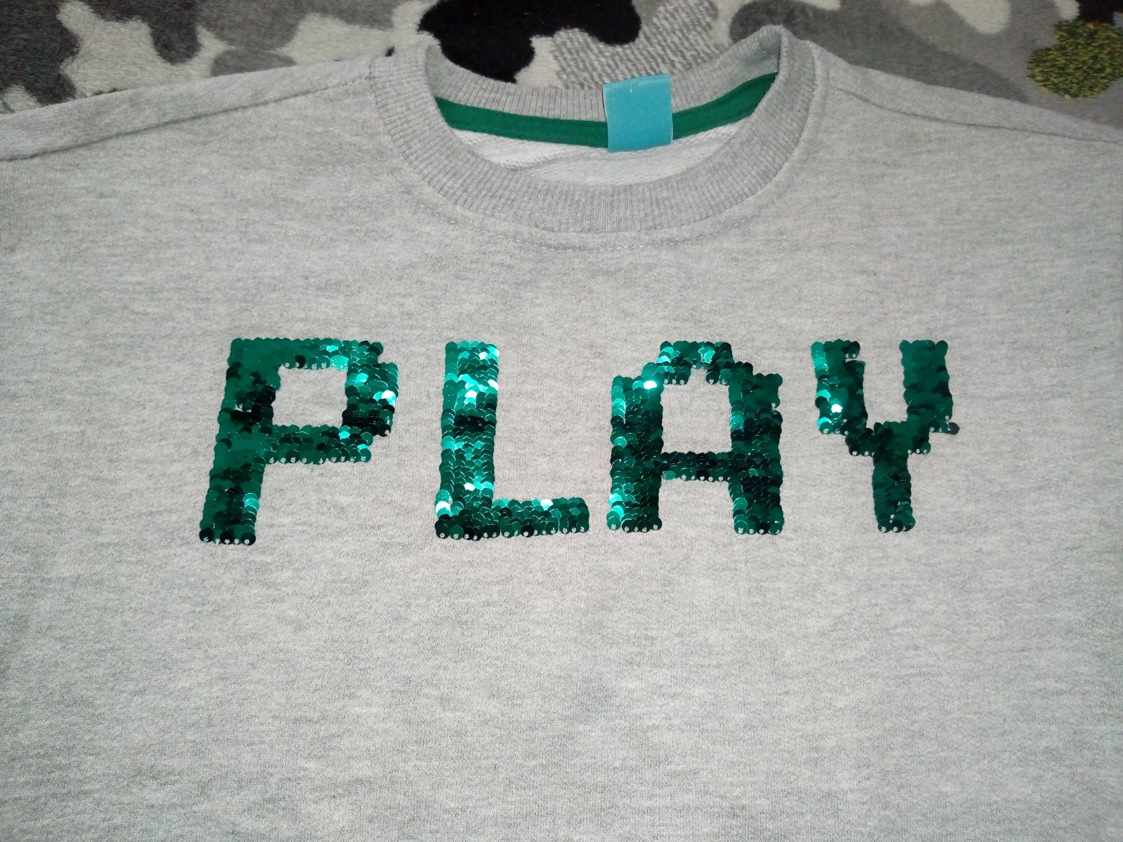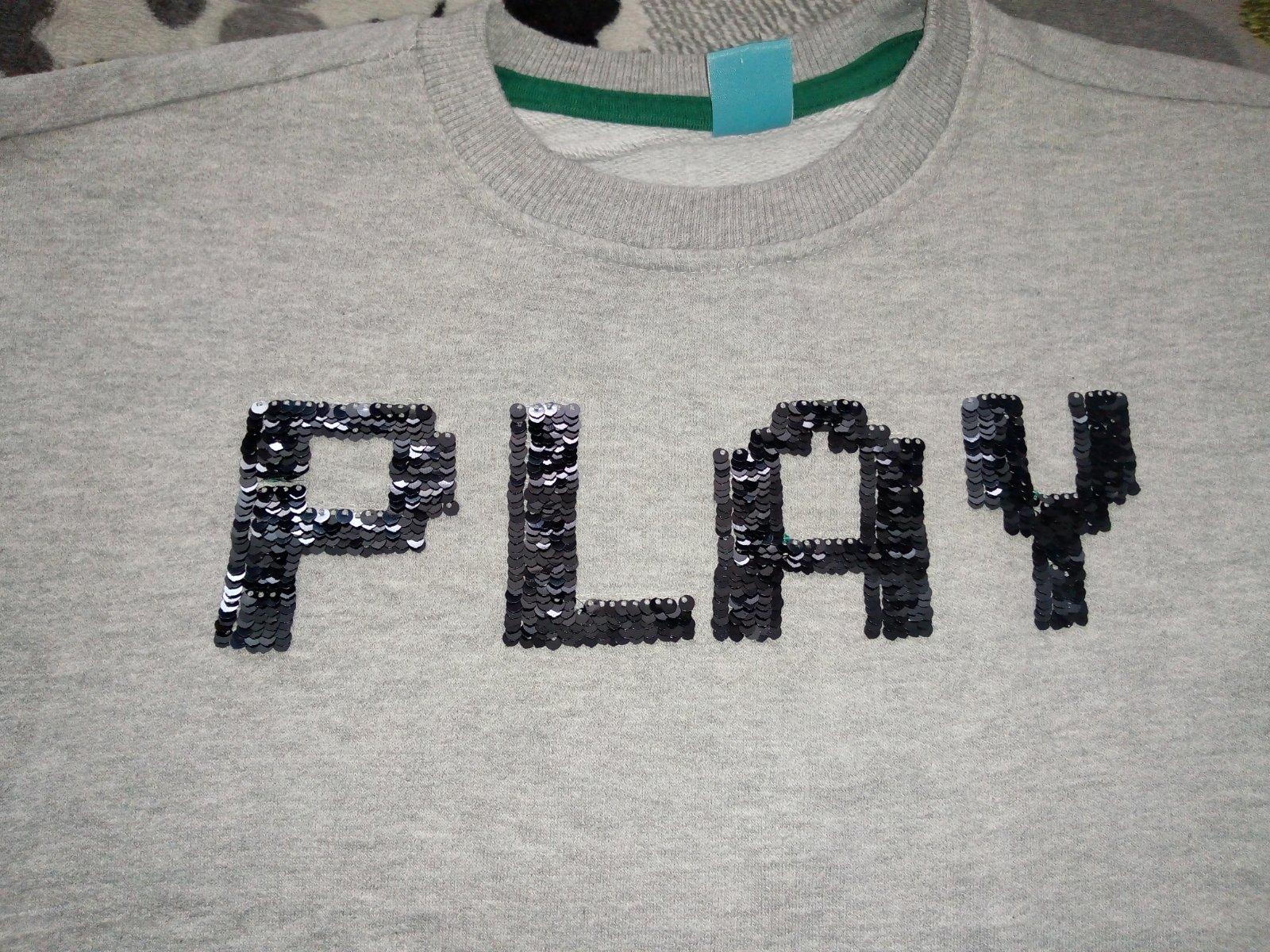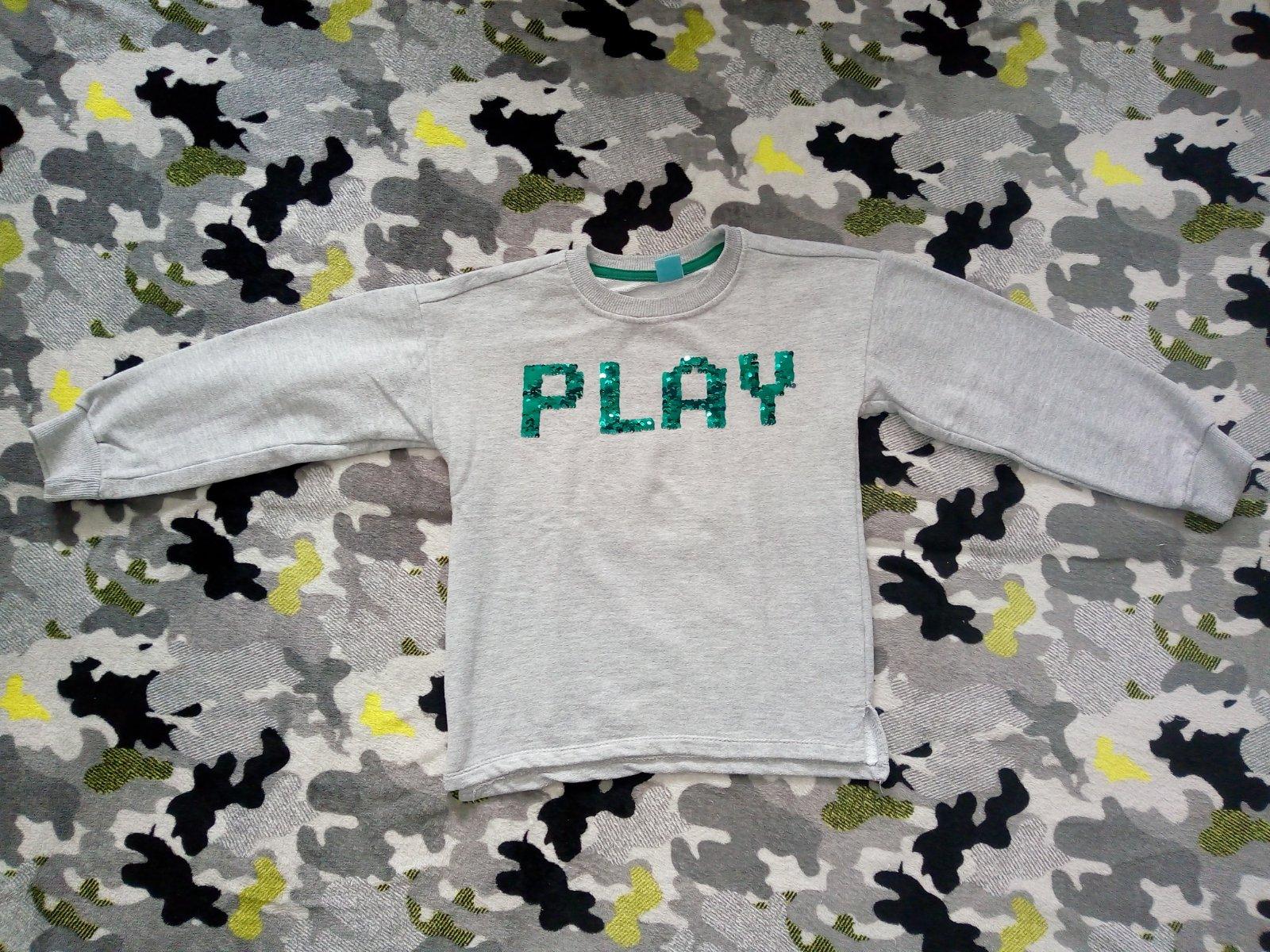 Pekná,málo nosená mikinka s meniacimi flitrami.Bez poškodenia.Dĺ.50cm,š.39cm,rukáv 40cm + plece 14cm
