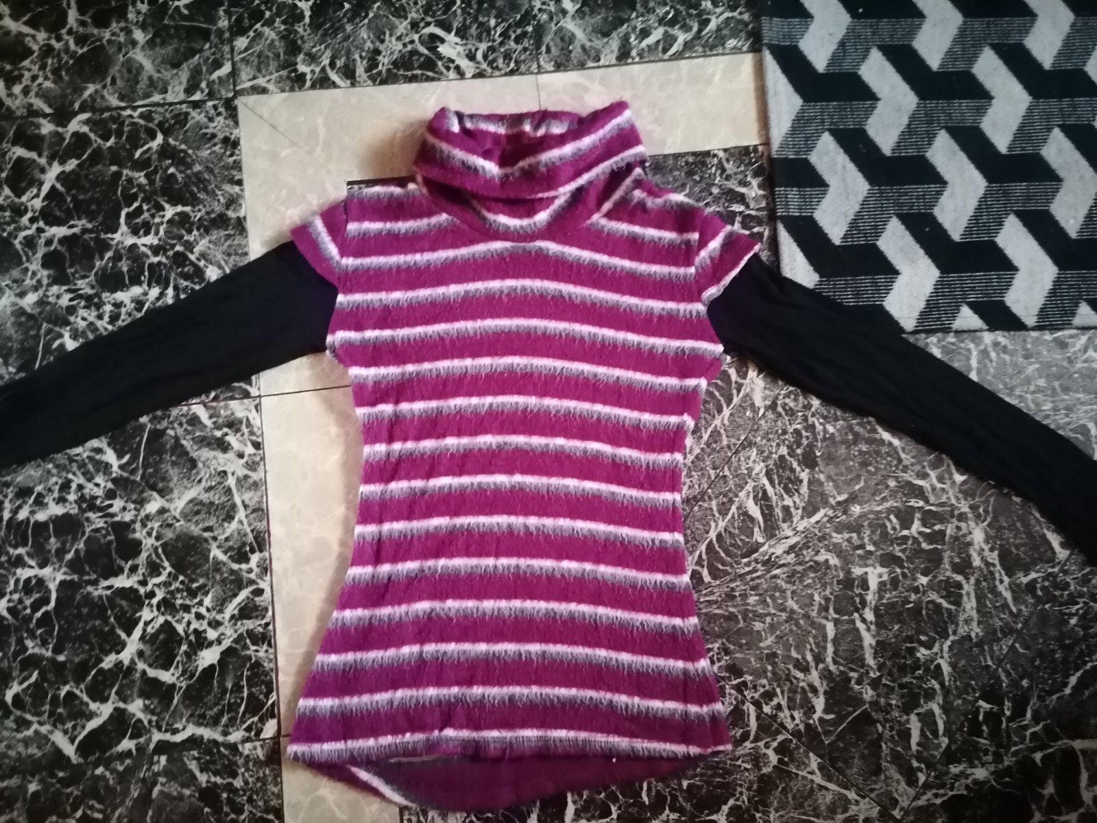 Fialovy svetrik s rolakom . rozmery Cez prsia 39cm Dlzka 51cm Rukavy 52cm