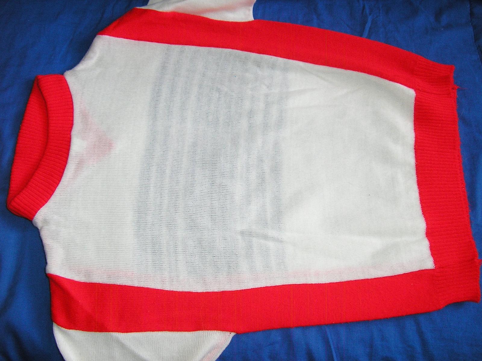 Zákl. farba: biela + červená, tm. modrá. Elegantný pulóvrik. Mäkký a veľmi príjemný materiál. Ruk. dlhé. Pulóver je v dobrom stave, vypratý, bez fľaku a poškodení, sem – tam sú drobné, maličké žmolky.