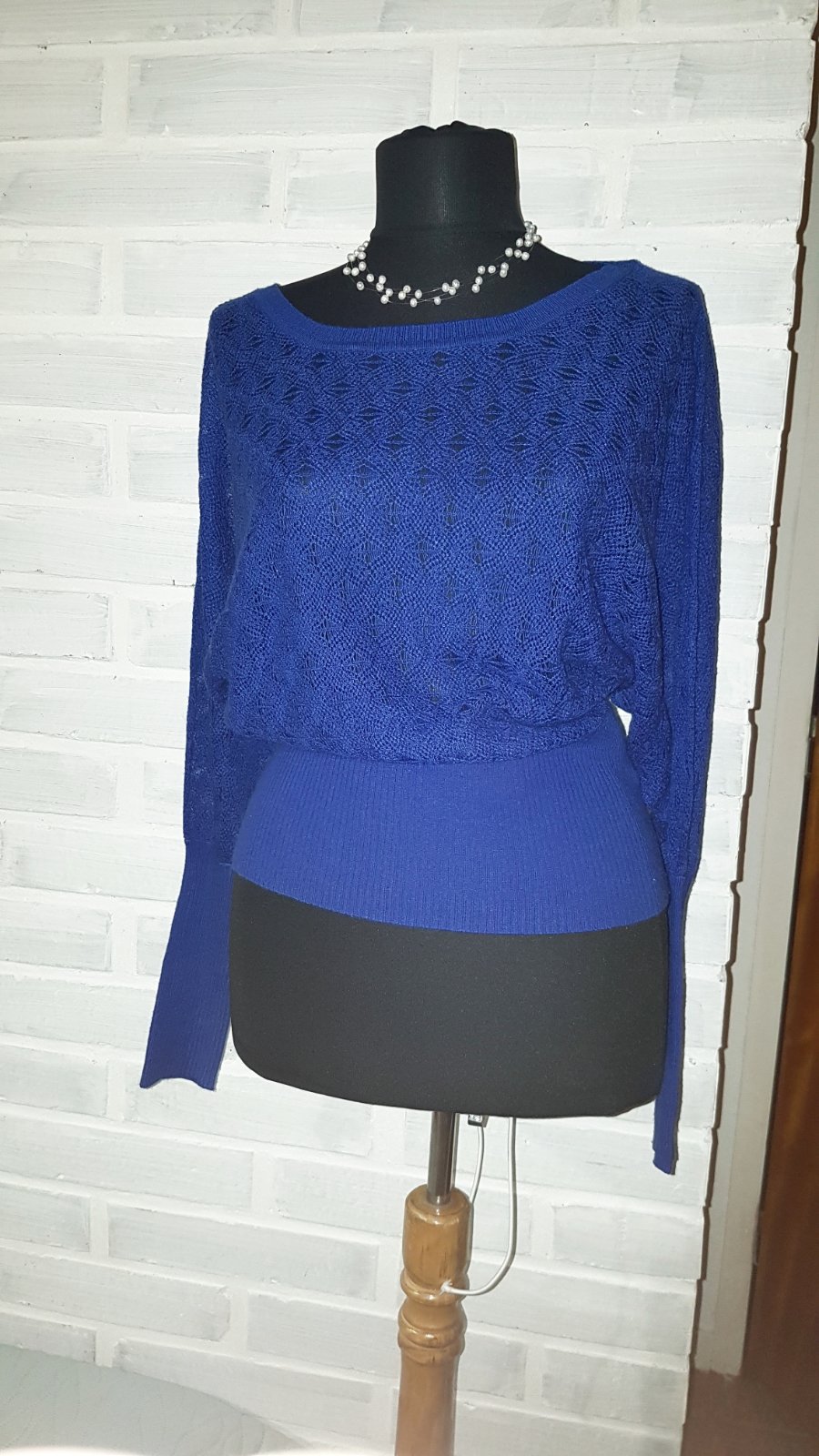 Nadherny modry sveter Miss Selfridge, uzasna kobaltova farba, vintage strih a styl, jemny hackovany vzor, netopierie rukavy, nadychane balonove, velmi chic, noseny malo, nosenie vidno trochu na napletoch
