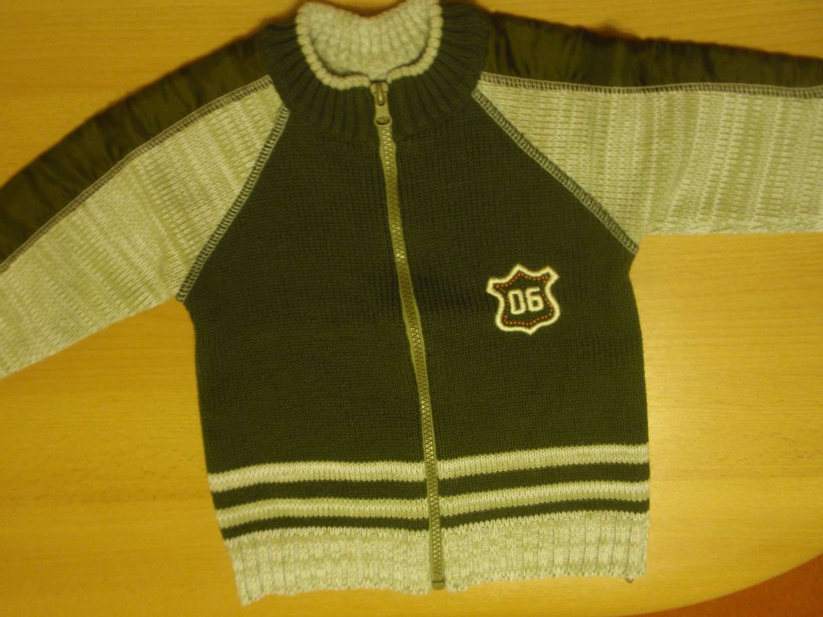 Nosený v dobrom stave bez pošdkodení, pôvodná farba - olivovo sivá (ako na foto) , teplučký v. 110 , RO: 2x39cm, dl. 44m, r od krku 48cm/ 29,5cm