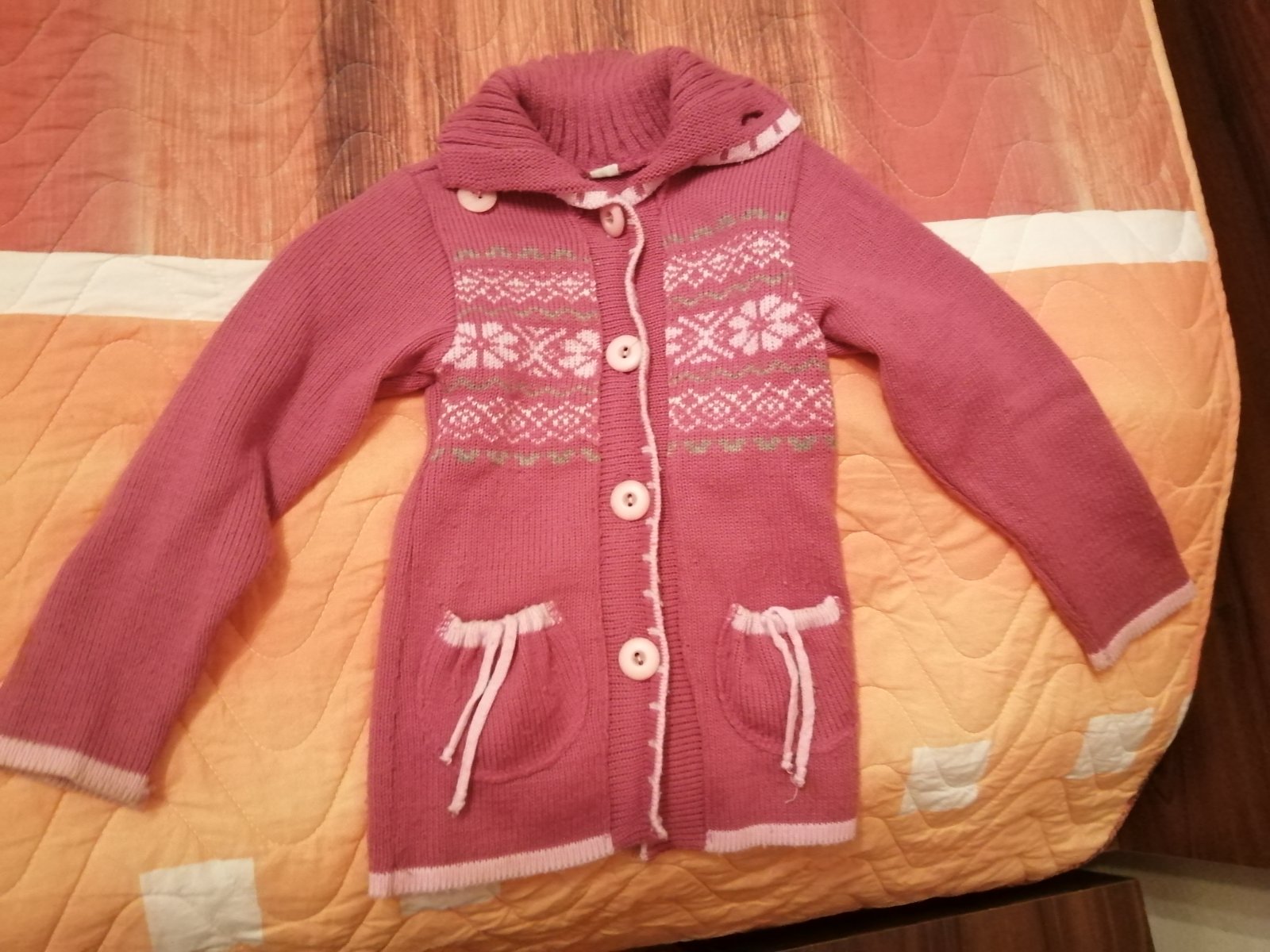 Milý dievčenský sveter, rôzno farebný, vlna, na zips, vrecká, zn. neviem ani veľkosť, odstrihli sme štítok, ale nosili sme to vo veľ.110/116, premeriam, veľmi pekný stav, bez žmolkov, milé trblieta...