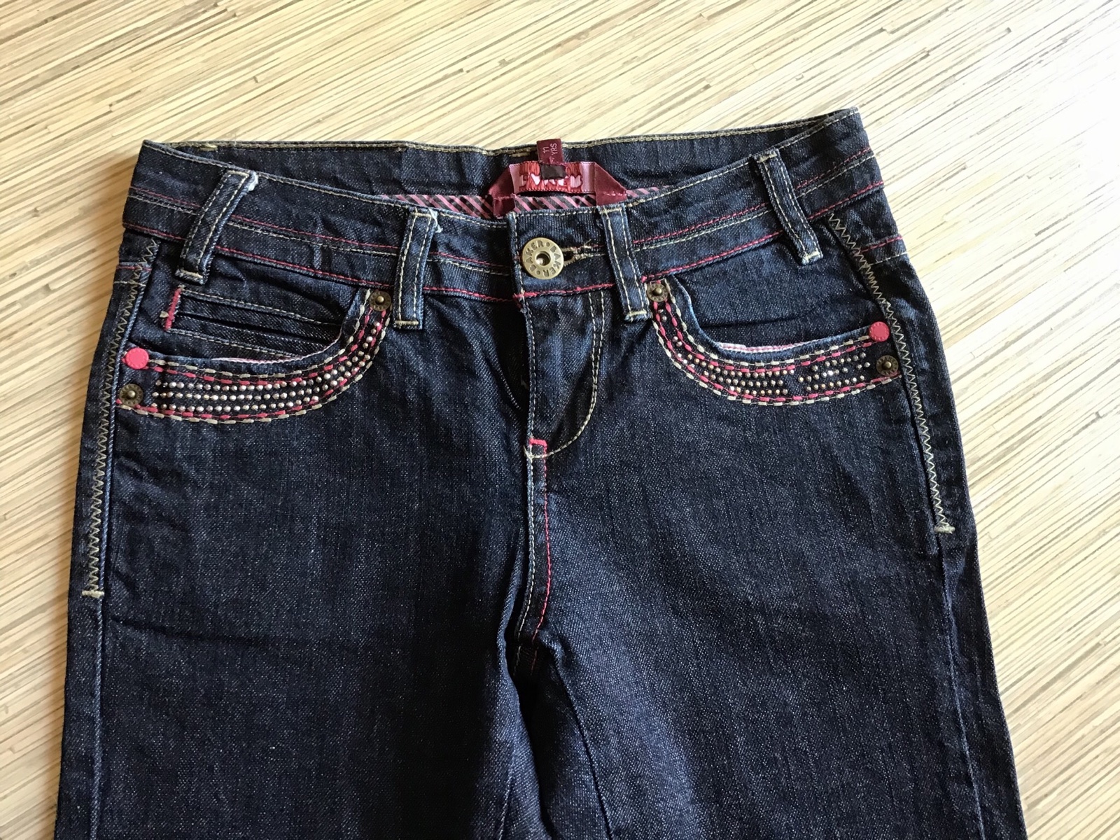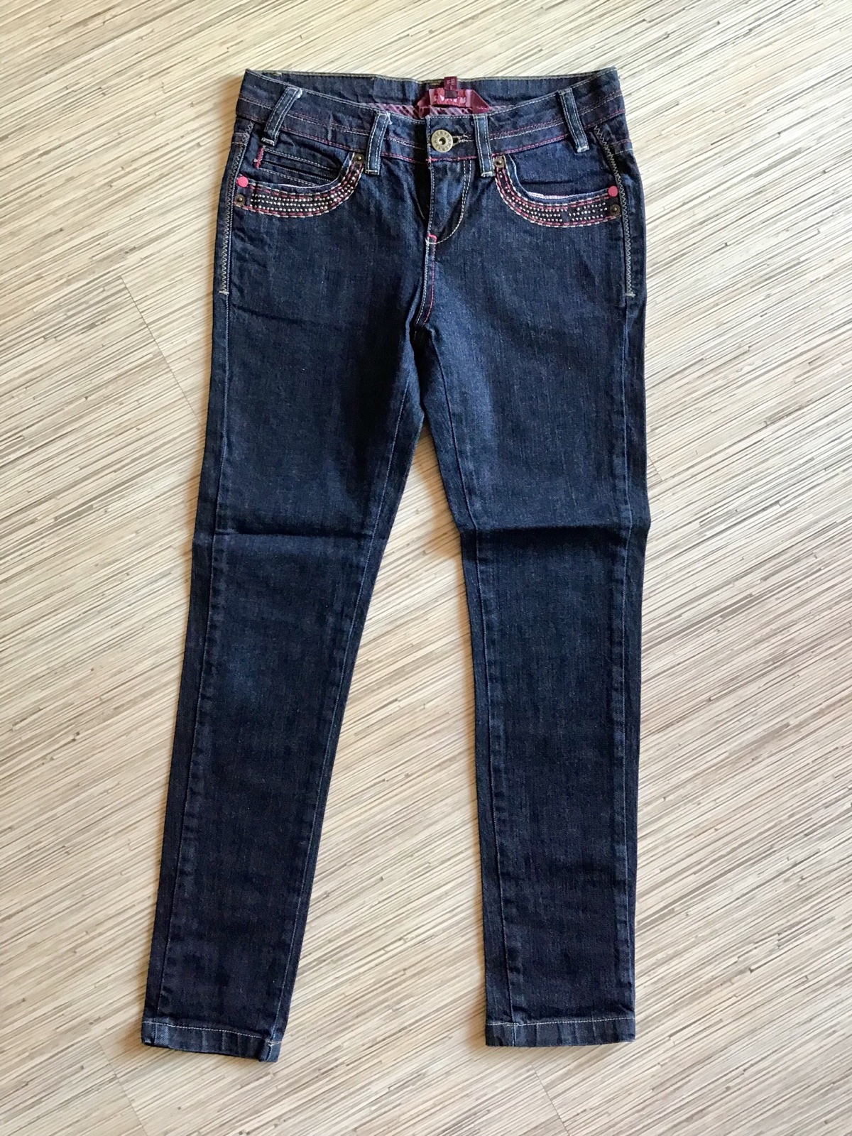 Krasne bezchybne kvalitné rifle,bavlna,elastan,slimky,vysívky a štrasy na vreckach,d-86,5/66,pas 72,5 dookola