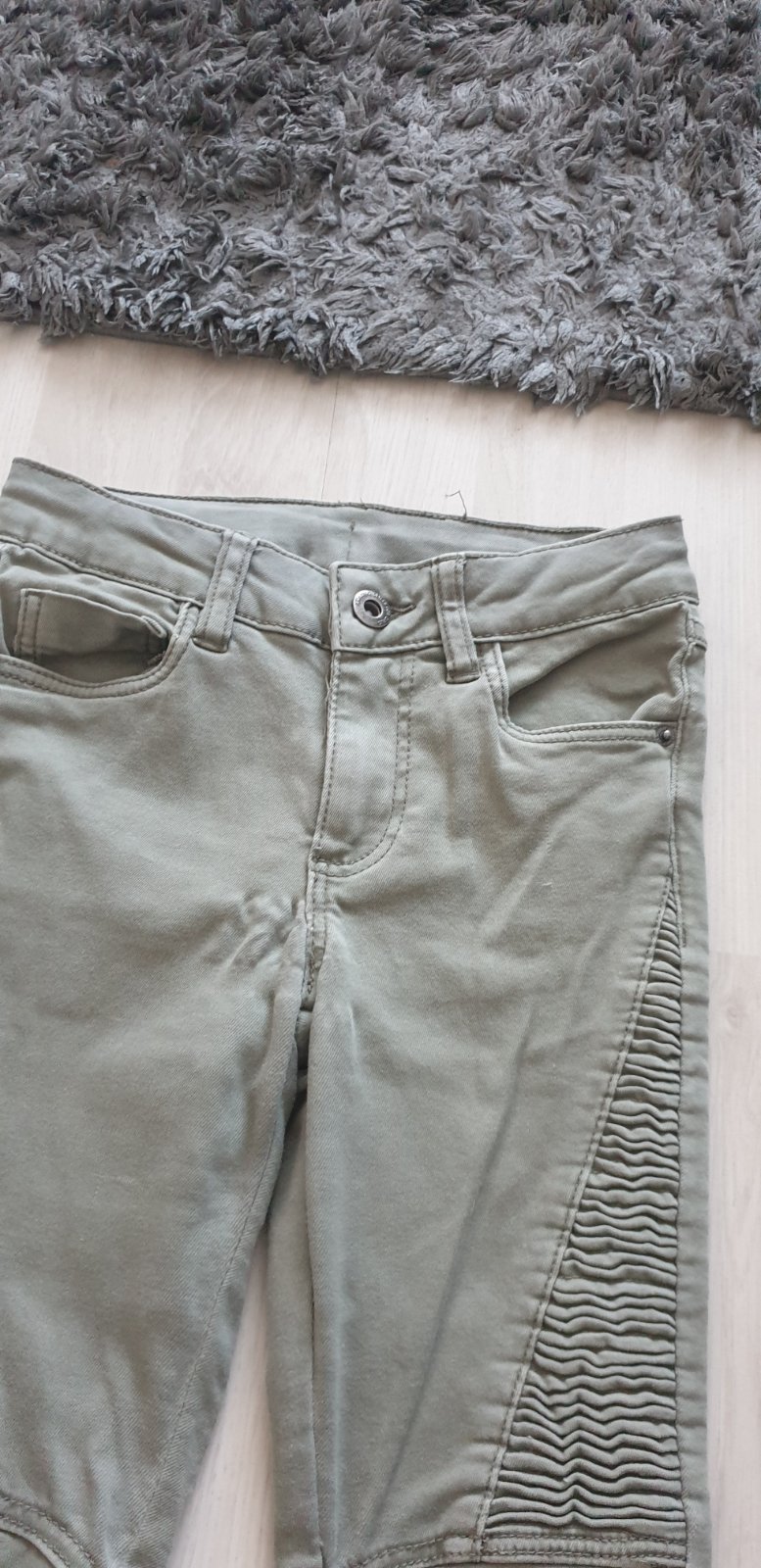 Nohavice sú také zeleno-sivé. Veľkosť odhadom - rozmery na foto. Kolená trochu ošúchané viď foto. Vybíjané prvky a Leo vzor 🙂 +pošta
