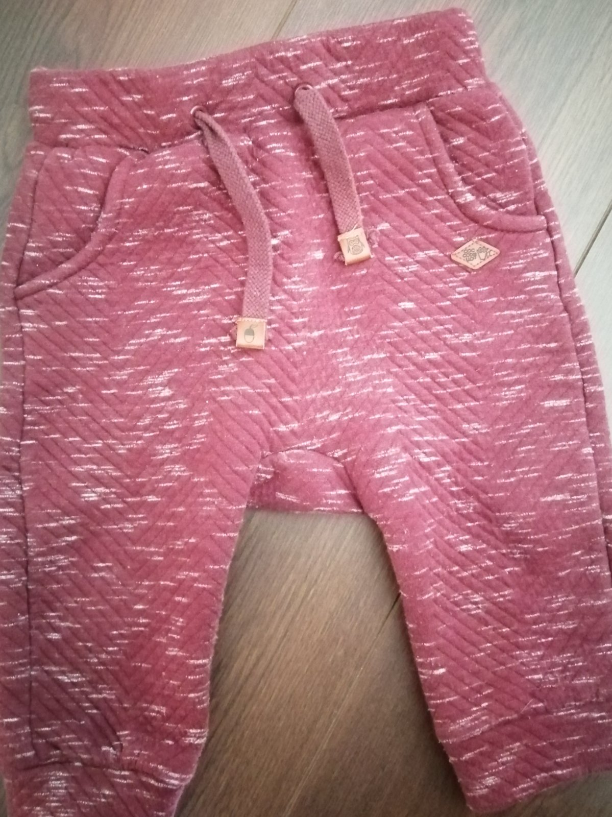 Nové, iba opraté nohavice. Vrchný materiál vyzerá ako zamat, podšité úpletom, pás guma + funkčná šnúrka. Sú pekné, vhodné na jeseň, my sme nestihli vynosiť. Cena je bez poštovného.