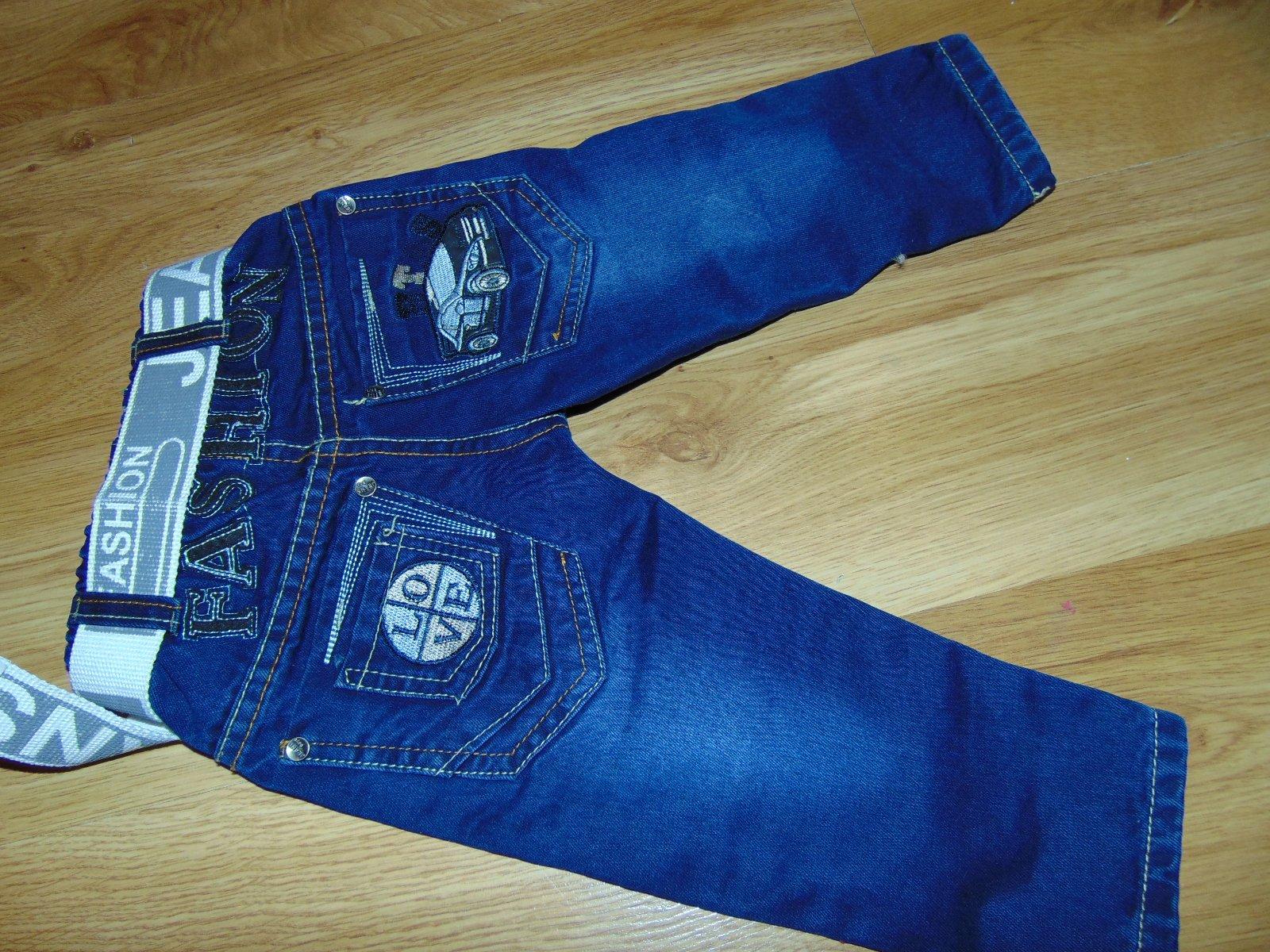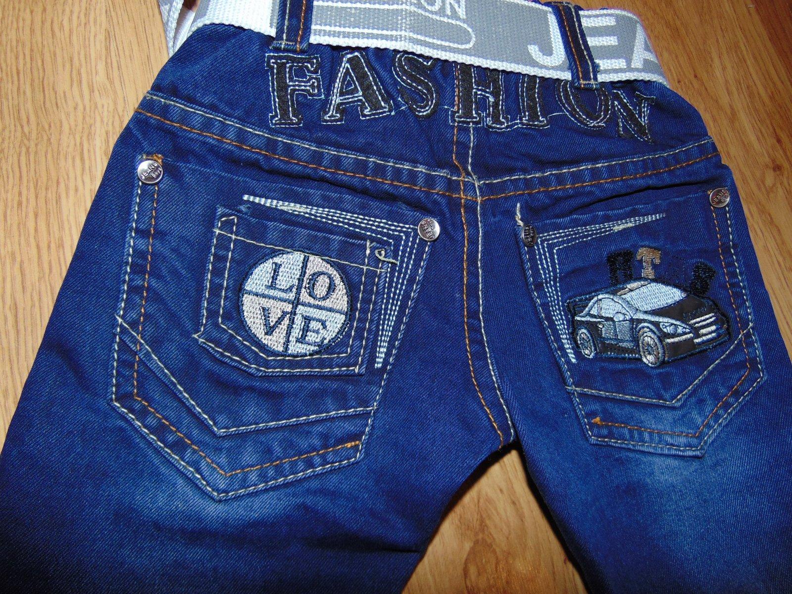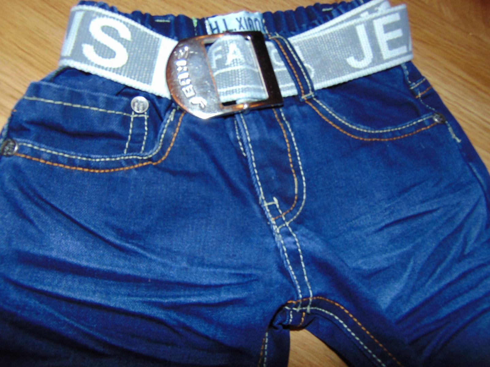 predam nadherne riflicky s opaskom, v pase je gumicka,,, dlzka nohavic je 43cm pas v klude 2x25cmm,, cislo je 74,,, tmavomodrej farby,, v zadu na vrecku aplikacia autoo- výšivka skutocne su nadherne a frajerske su ako nove cena 9,90