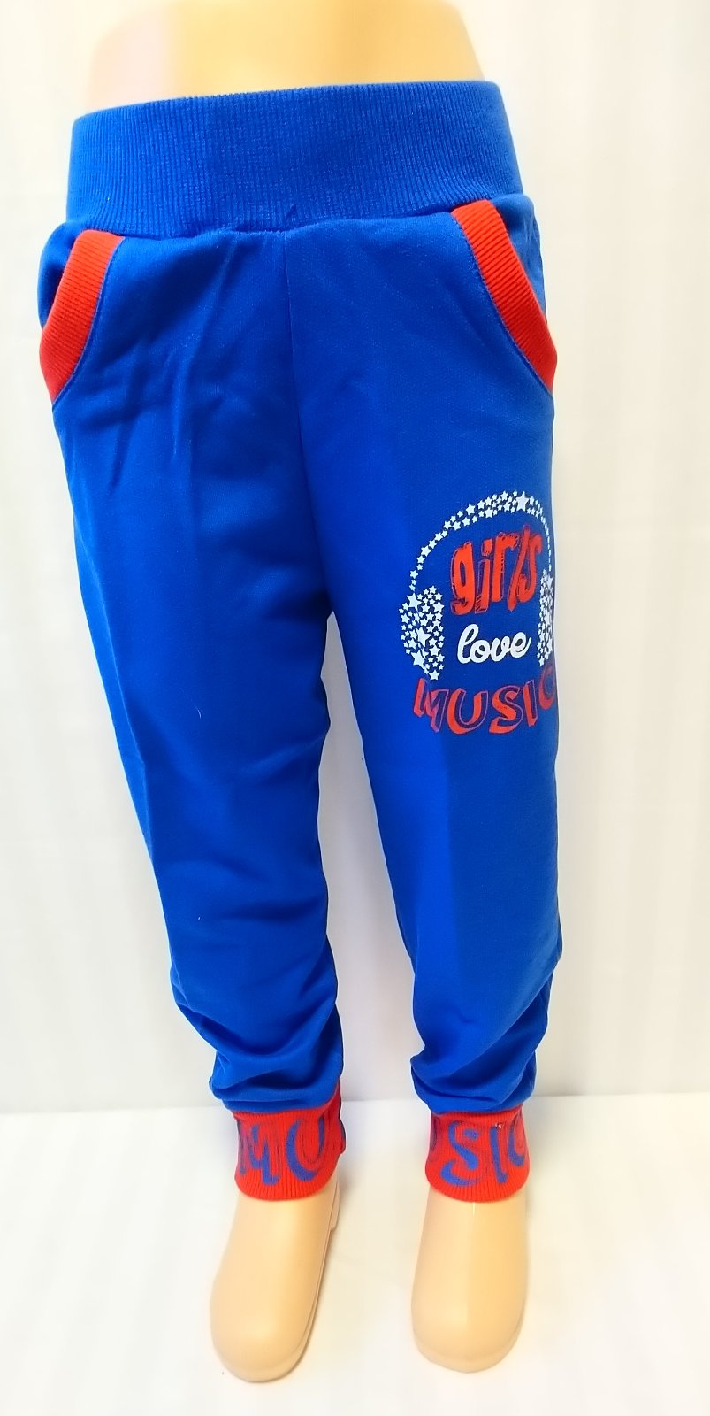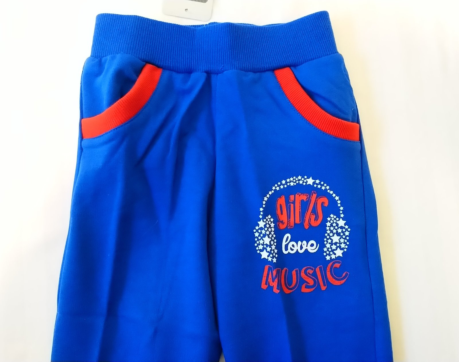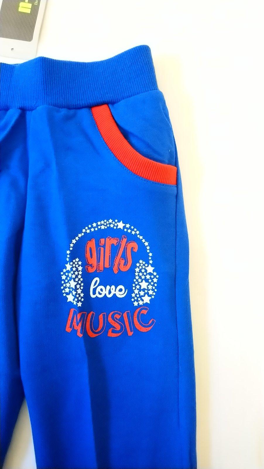 nové modré tepláky v páse na gumu, nohavice zakončené patentom, vrecká s kontrastným červeným lemovaním, motív girls love music, vhodné jar až jeseň,