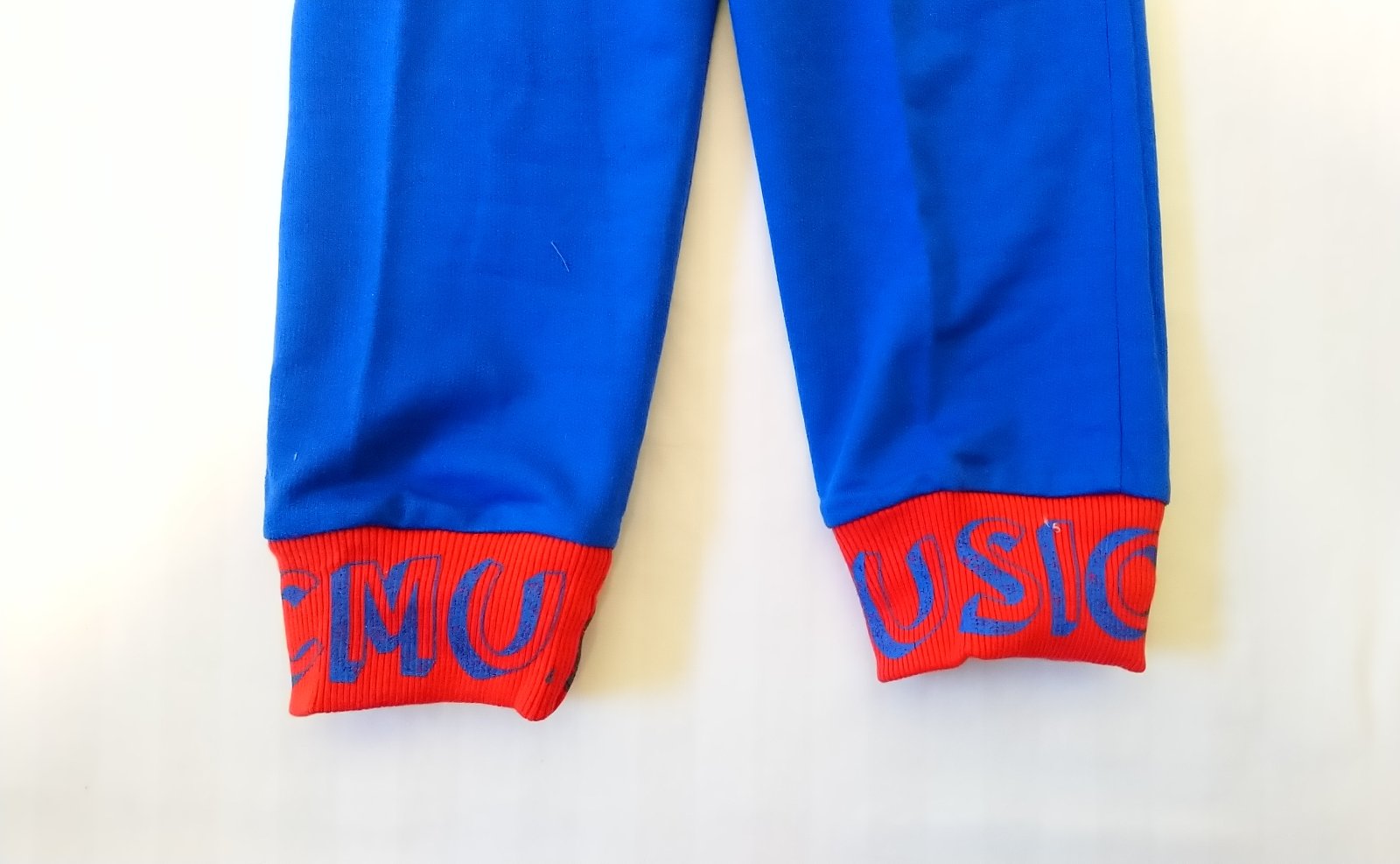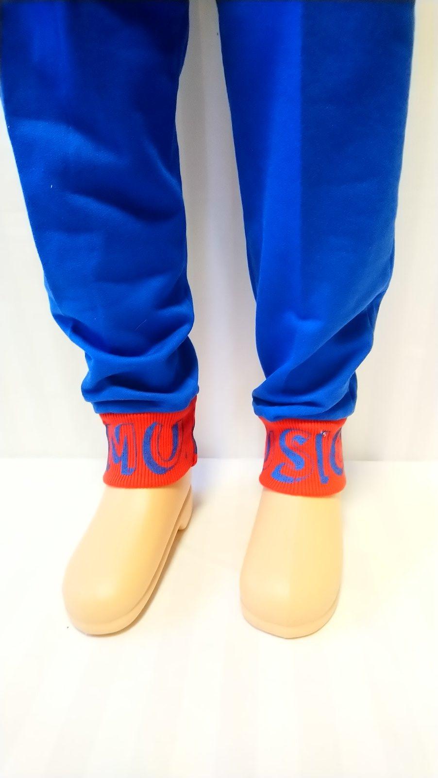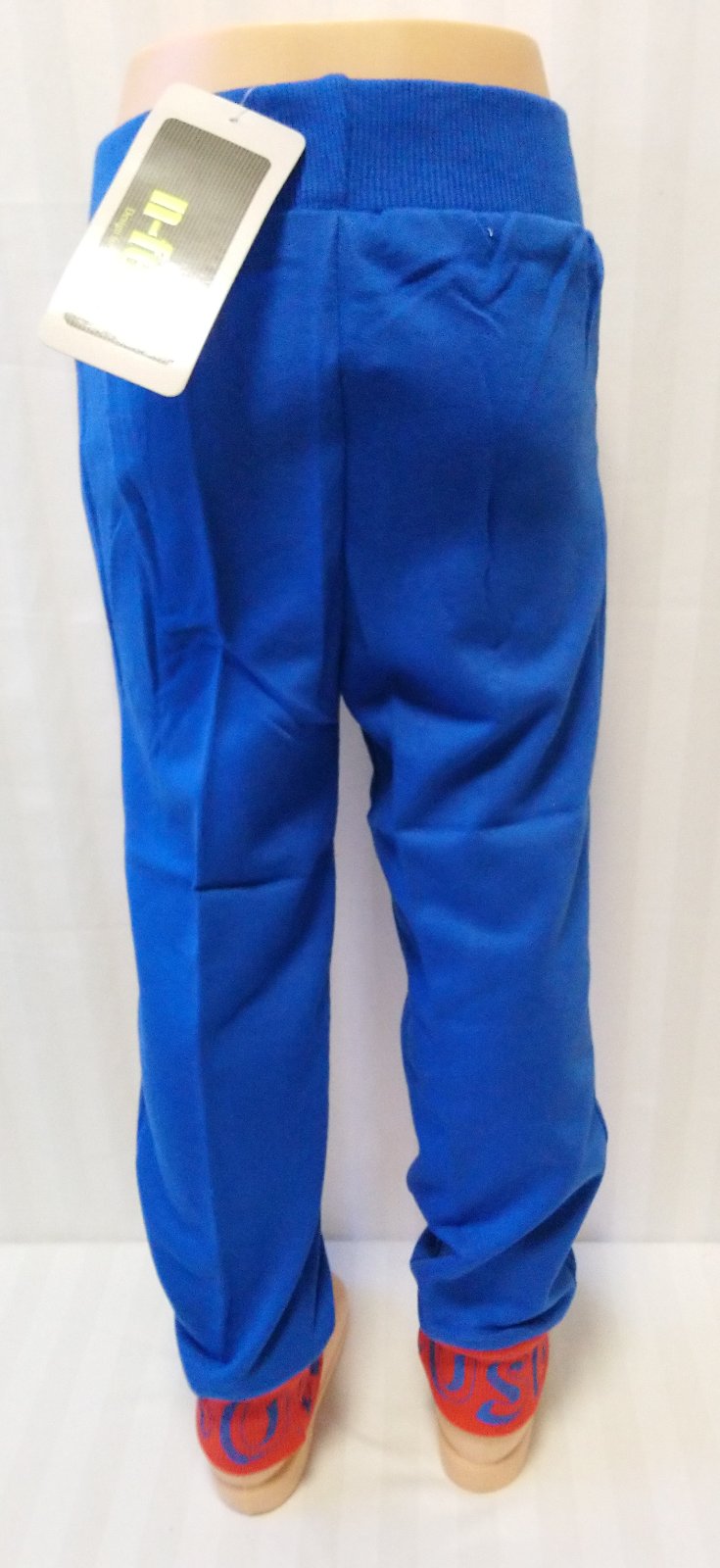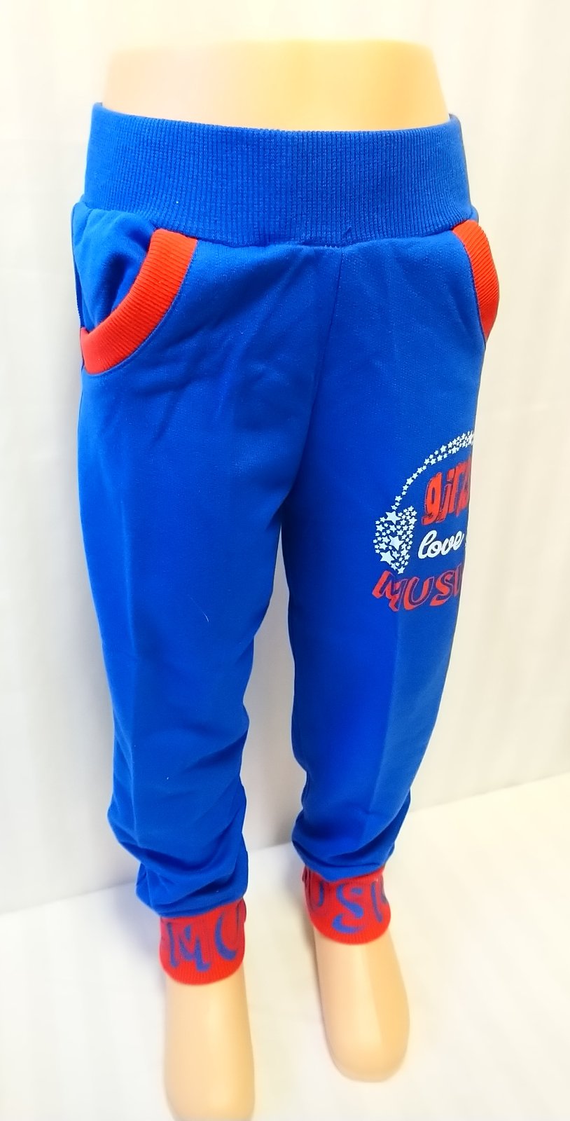 nové modré tepláky v páse na gumu, nohavice zakončené patentom, vrecká s kontrastným červeným lemovaním, motív girls love music, vhodné jar až jeseň,