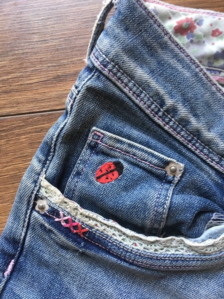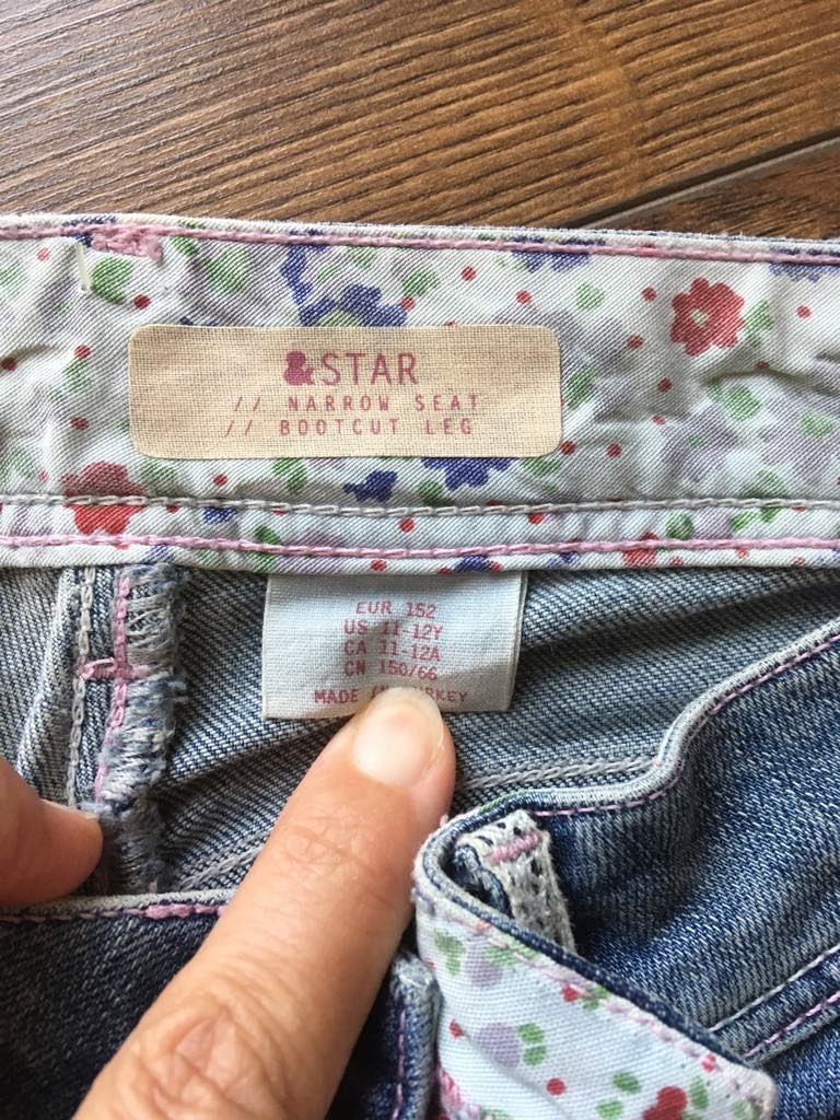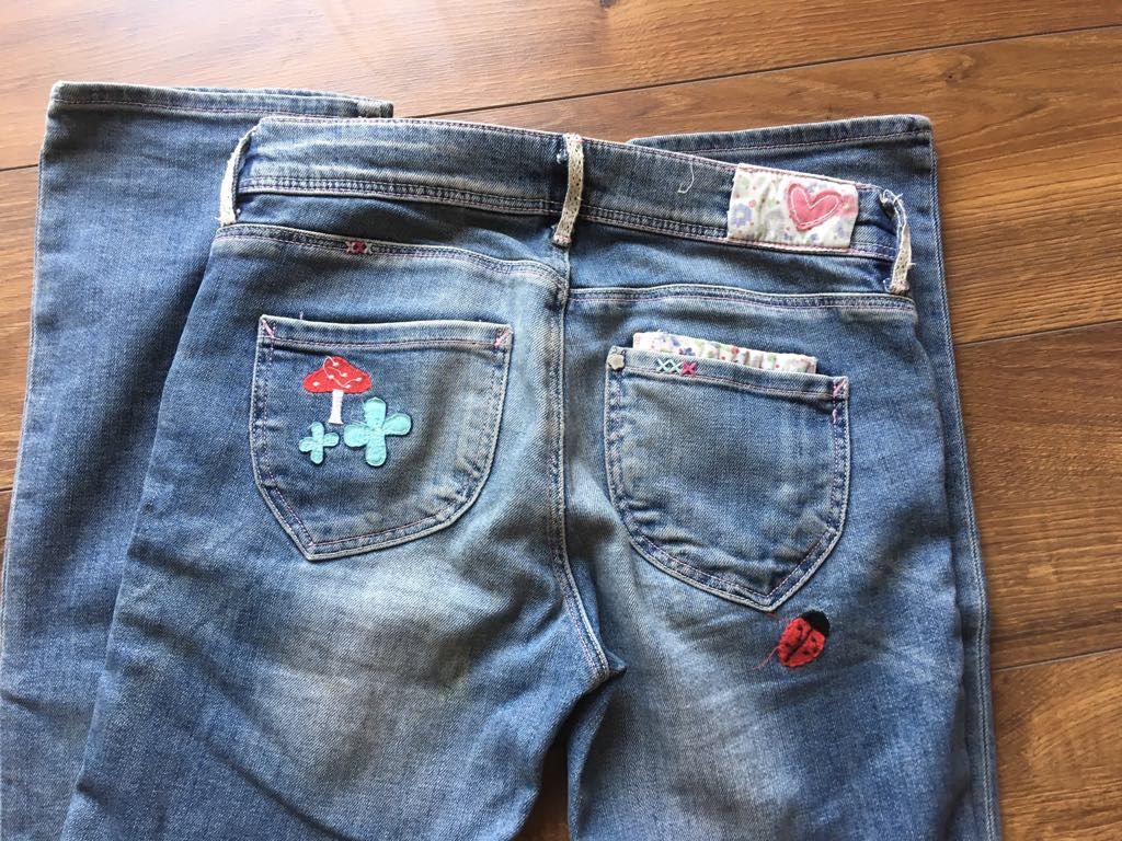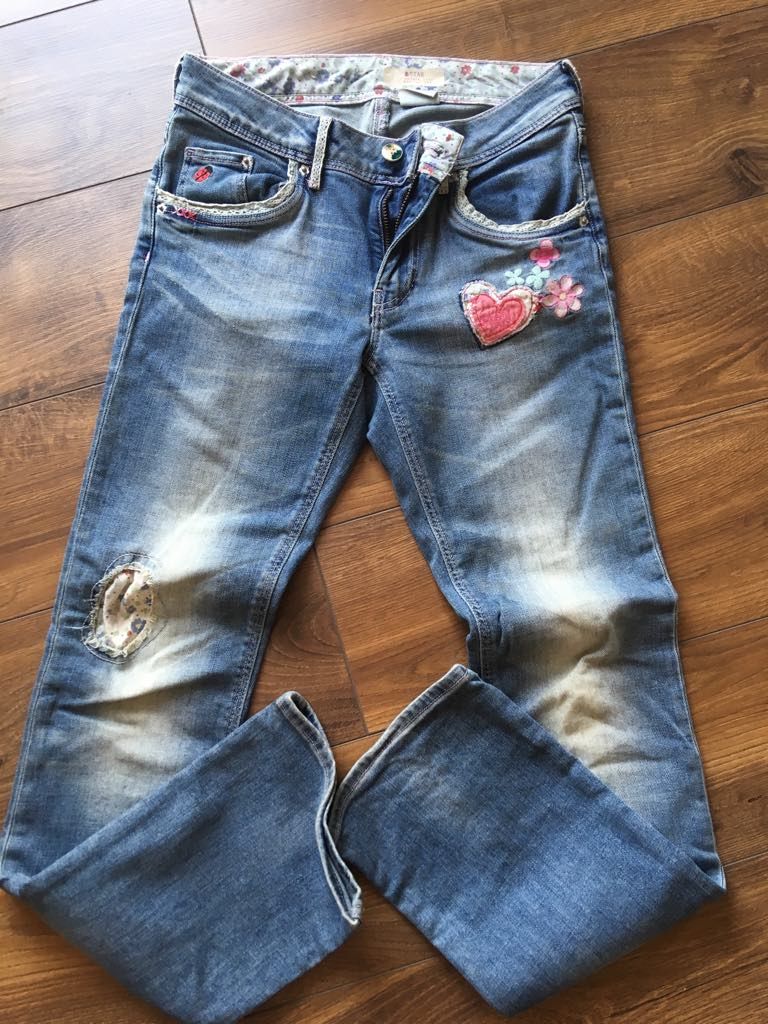 Krásne rifle vyšúchaného vzhľadu a farebnými nášivkami, velkost 152 (11-12 rokov)