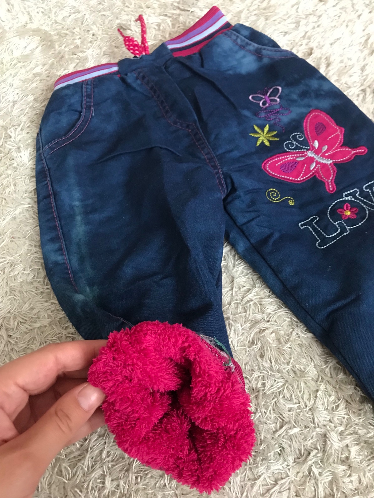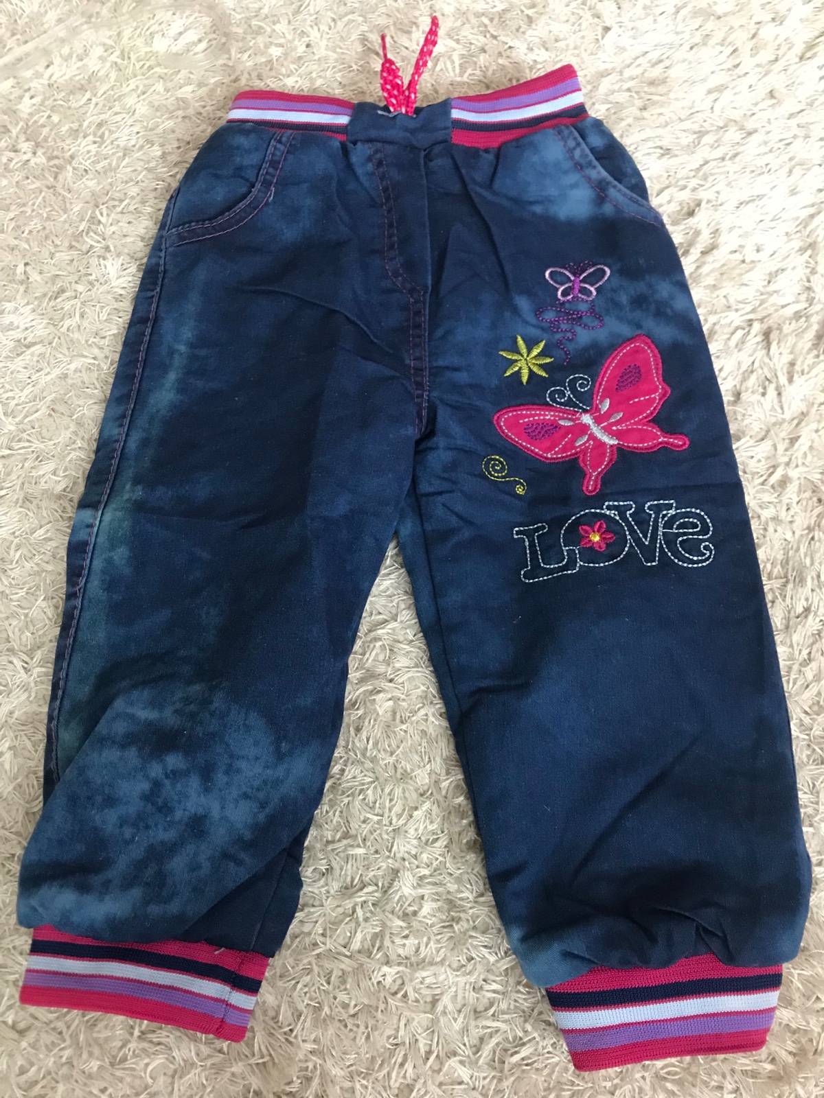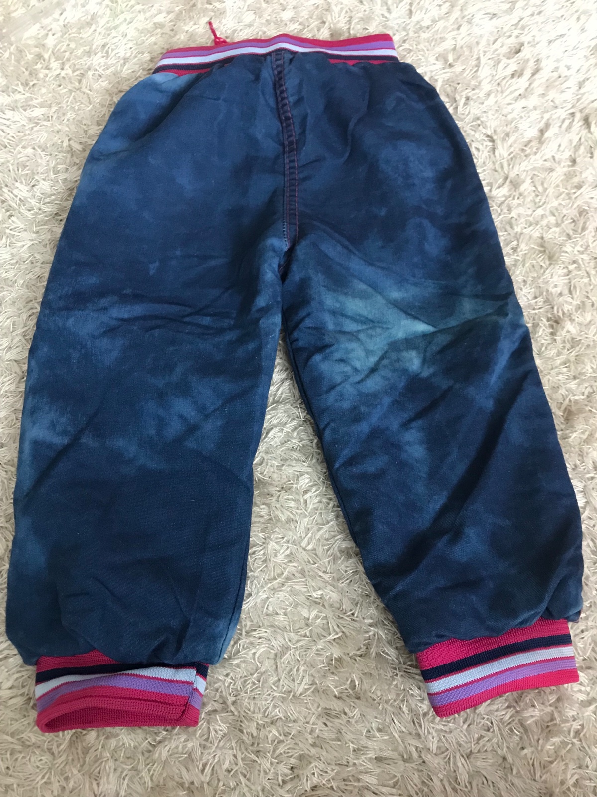 Nohavice sú v dobrom stave. Mierne vyblednutie vzadu v oblasti pravého kolienka, ťažko vidieť. Sú zateplené jednou vrstvou bavlny V páse elastická gumička. Dĺžka od rozkroku 27 cm Celková dĺžka 45,...