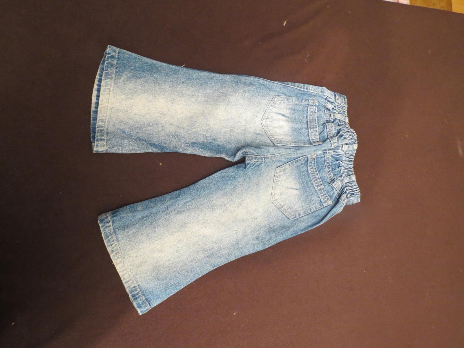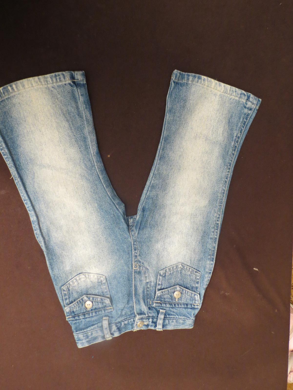 Bledomodré rifle, v páse čiastočne na gumu, vzadu aj vpredu sú vrecká. Nosené.
