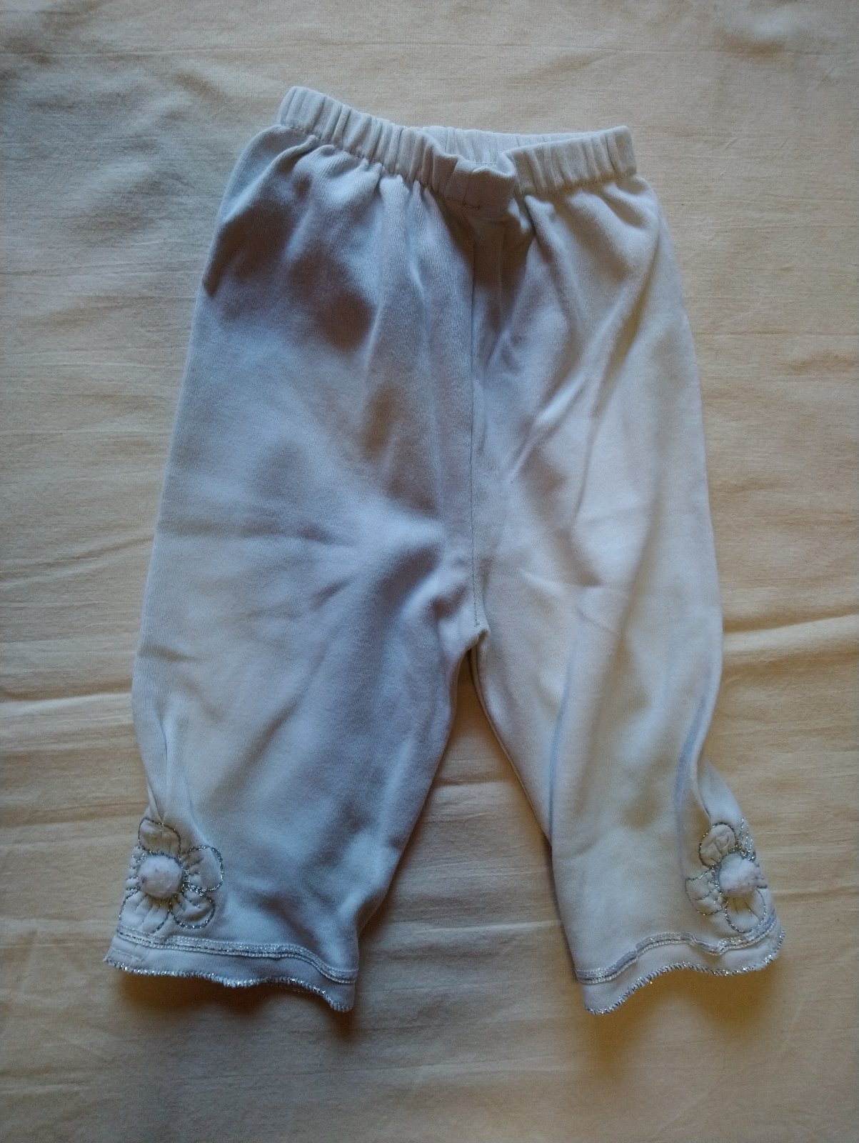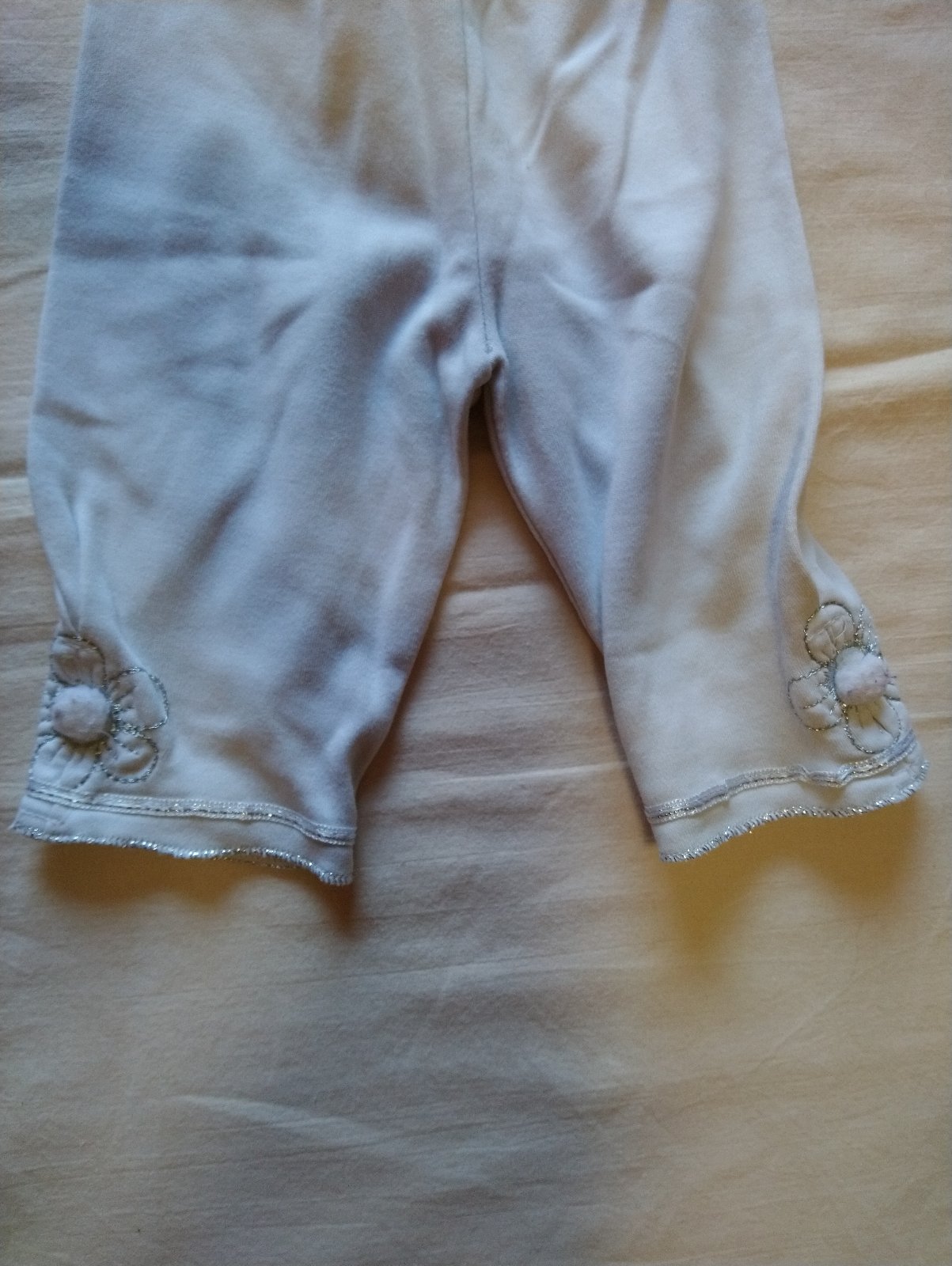 veľkosť 62 cm, dievčenské tenké biele nohavice dole na bokoch vyzdobené s kvetinkou so strieborným lemovaním, v páse na gumu, pekné, v dobrom nosenom stave, príjemný kvalitný materiál, porovnaj si miery.