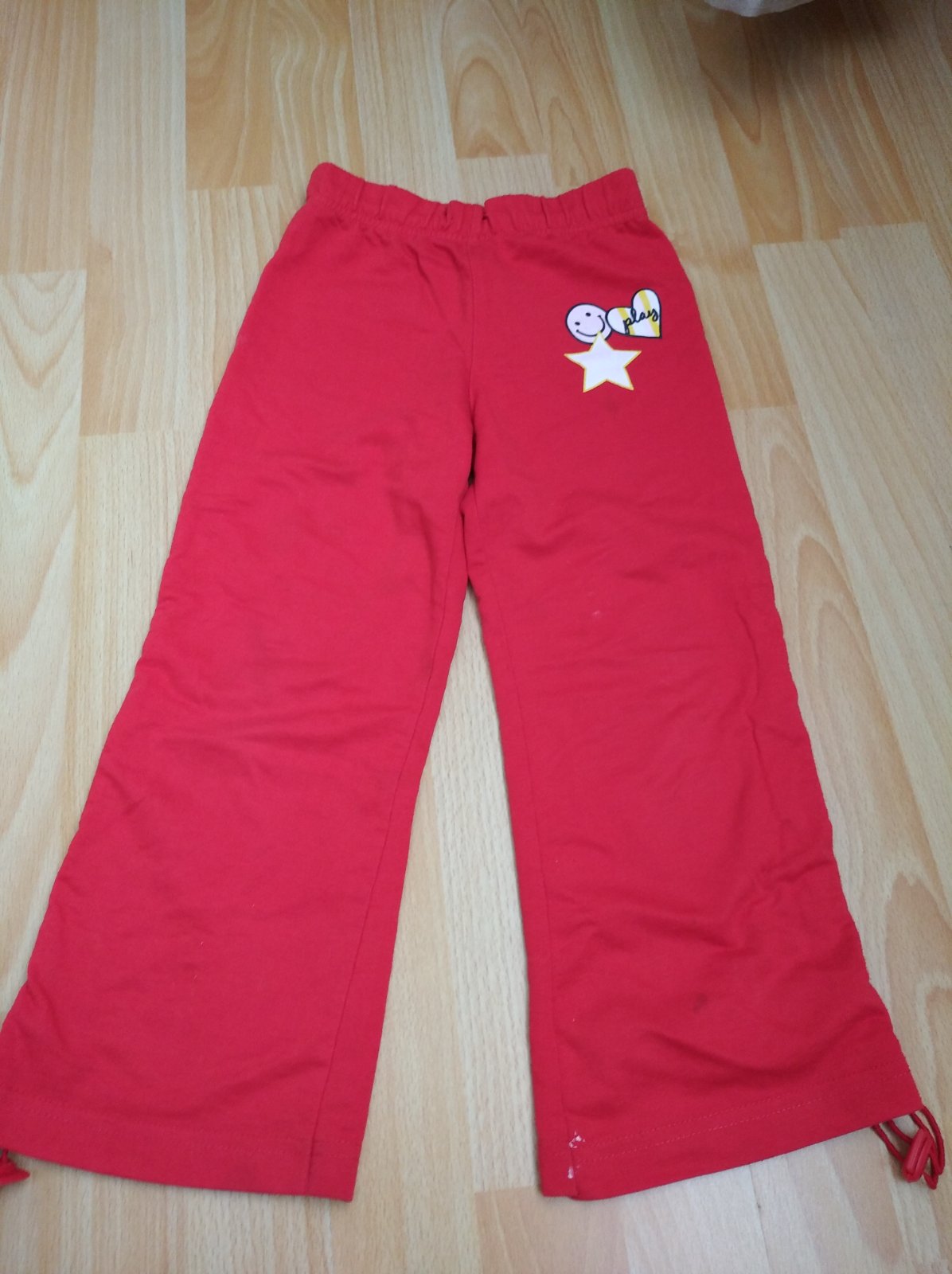 Tenké tepláky, ktoré majú na bokoch tunel na nariadenie -uz tam treba vymeniť gumičky. Inak pekný nosený stav, sýta farba. Na jednej nohe celkom dole mini biely fliaciky.