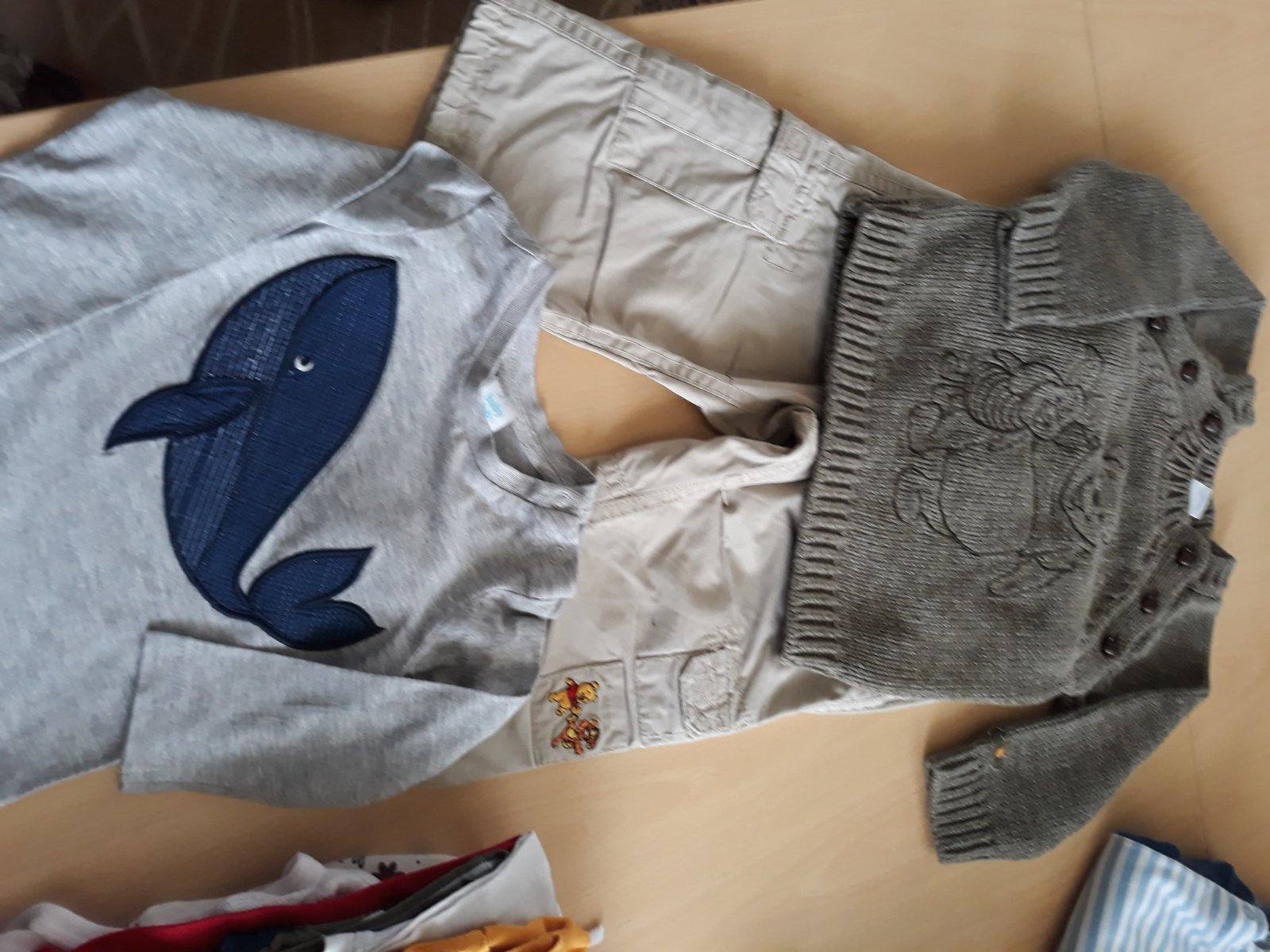 Nohavice na regulovatelny pas je tam gumka a gombiky ,podšite prijemnou akoby tričkovinou tak na jar jesen.Velkost 74 etiketa nieje.Mam k nemu aj svetrik macko pu a aj natelnik s rybou spolu za komplet 5e.Samostatne cena za nohavice 2e .