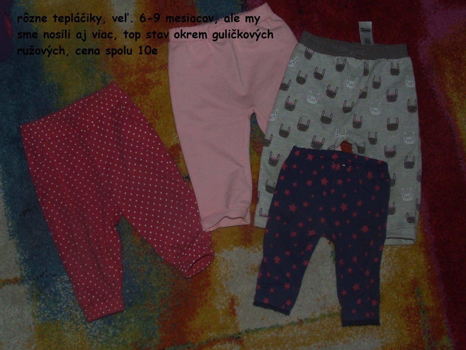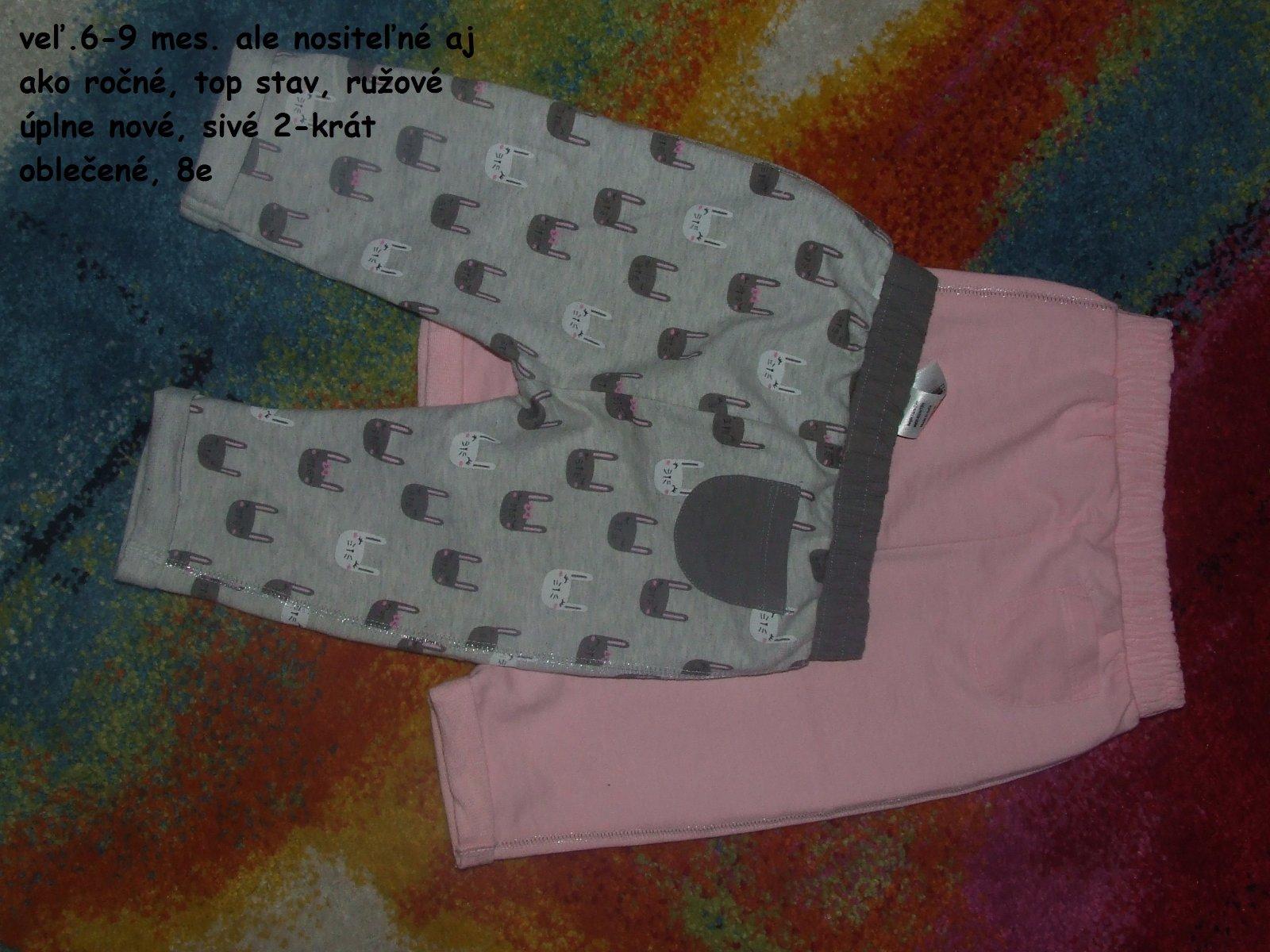 top stav, ružové - nenosené, šedé - 2x, ružové-guličkové - nosené žmolky, legínky - nosené top, veľkost 6-9 mesiacov, ale nositeľné aj ako ročné,...